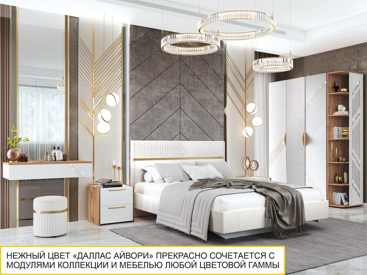 - Актуальный цвет обивки кровати «Даллас Айвори» прекрасно сочетается с модулями коллекции, а также с предметами интерьера любой другой цветовой гаммы.