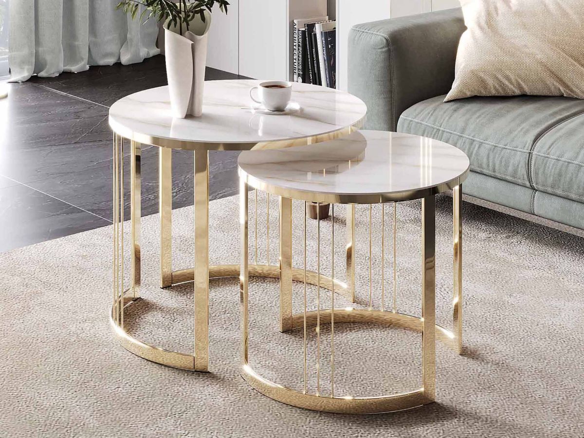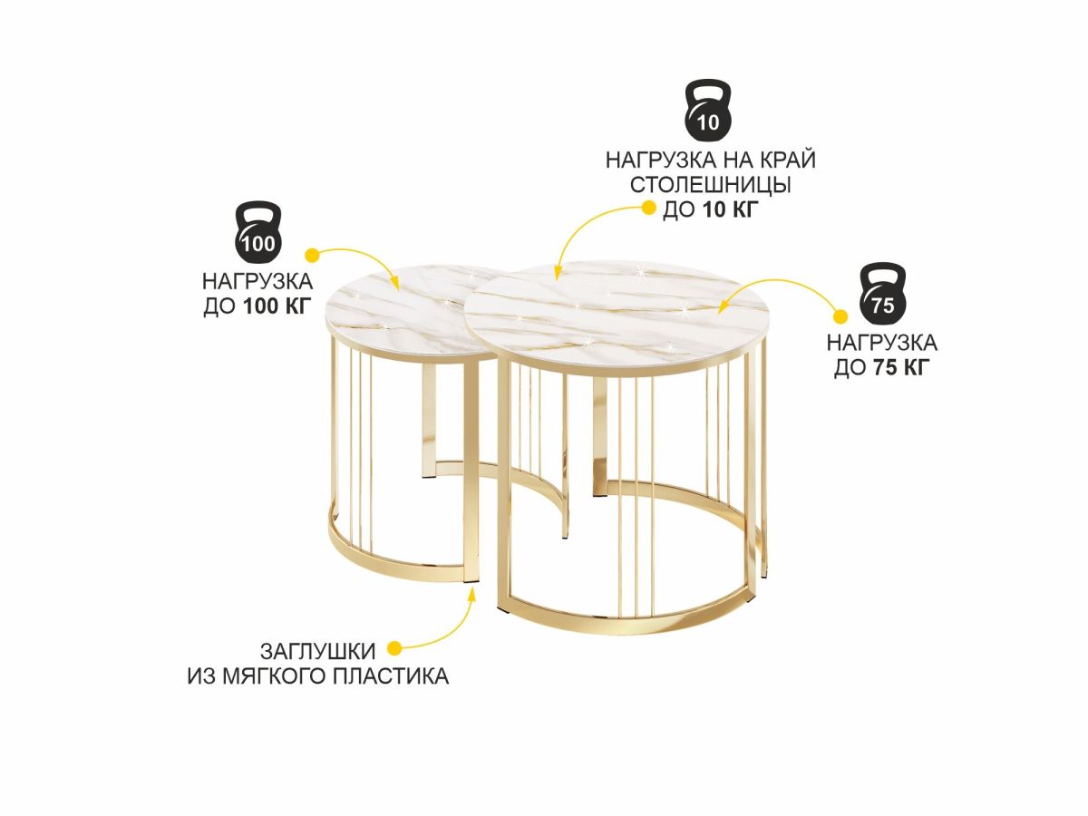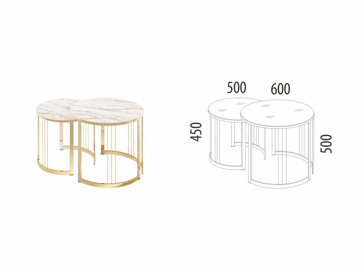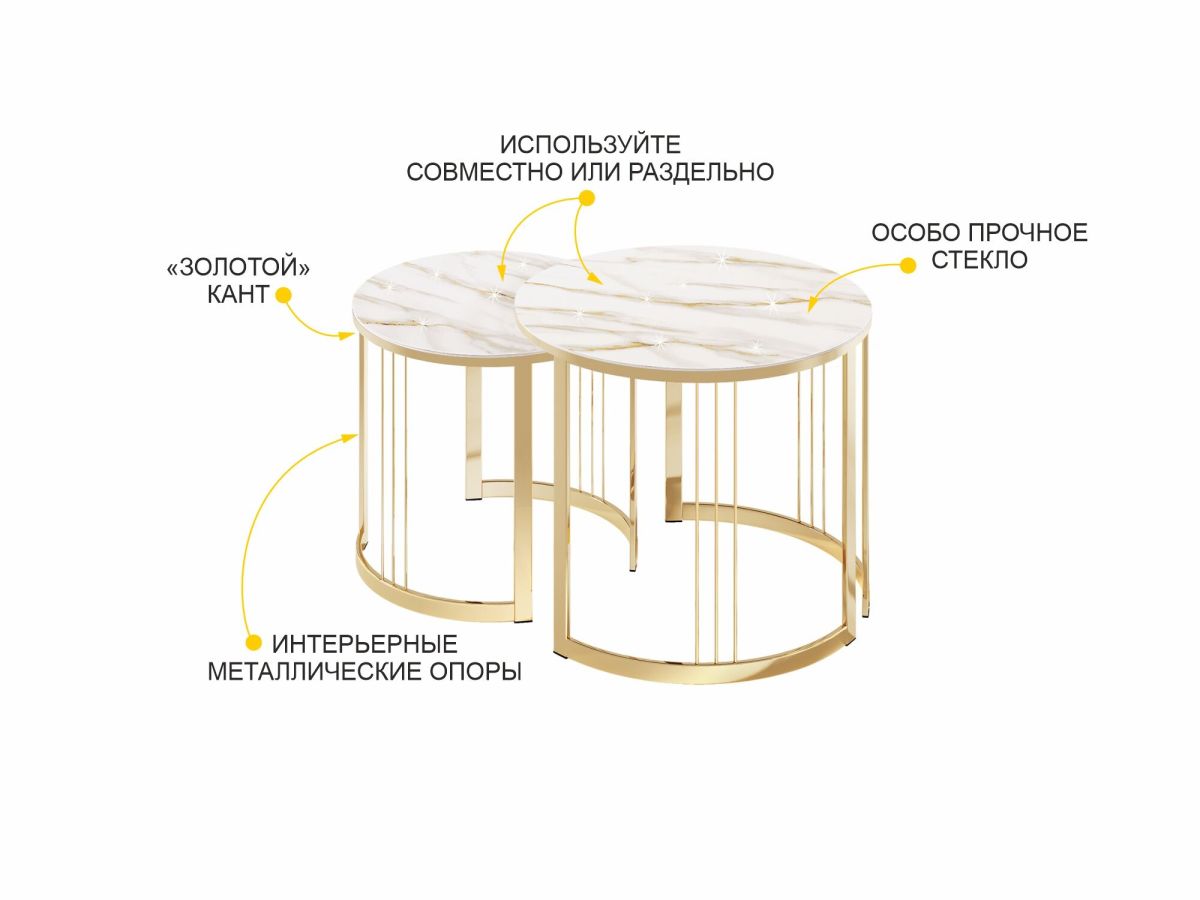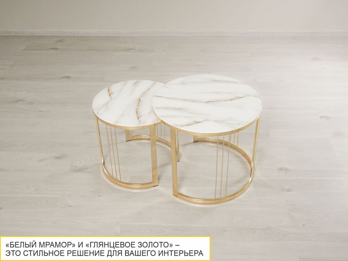 Столики выполнены в современном стиле, который удачно сочетает в себе элегантность и практичность. Круглая форма столешницы делает мебель удобной и комфортной в использовании. Комбинация «белого мрамора» и «глянцевого золота» выглядит стильно и эффектно. Идеальное решение для тех, кто хочет добавить в интерьер элегантности.