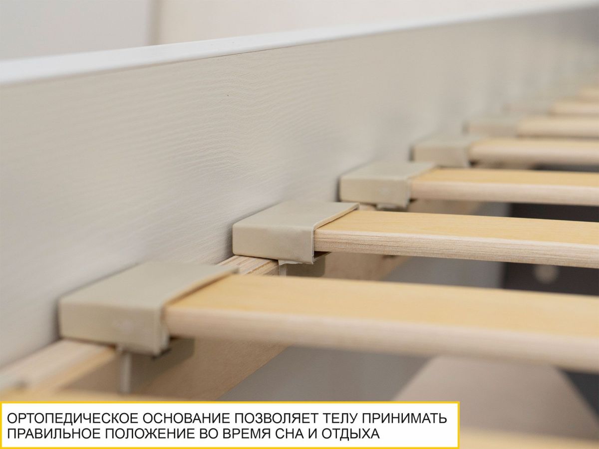 • Кровать укомплектована ортопедическим основанием, которое помогает телу принимать правильное положение во время сна и отдыха. Также оно позволяет матрасу «дышать», оберегает его от деформации и значительно продлевает срок службы.
