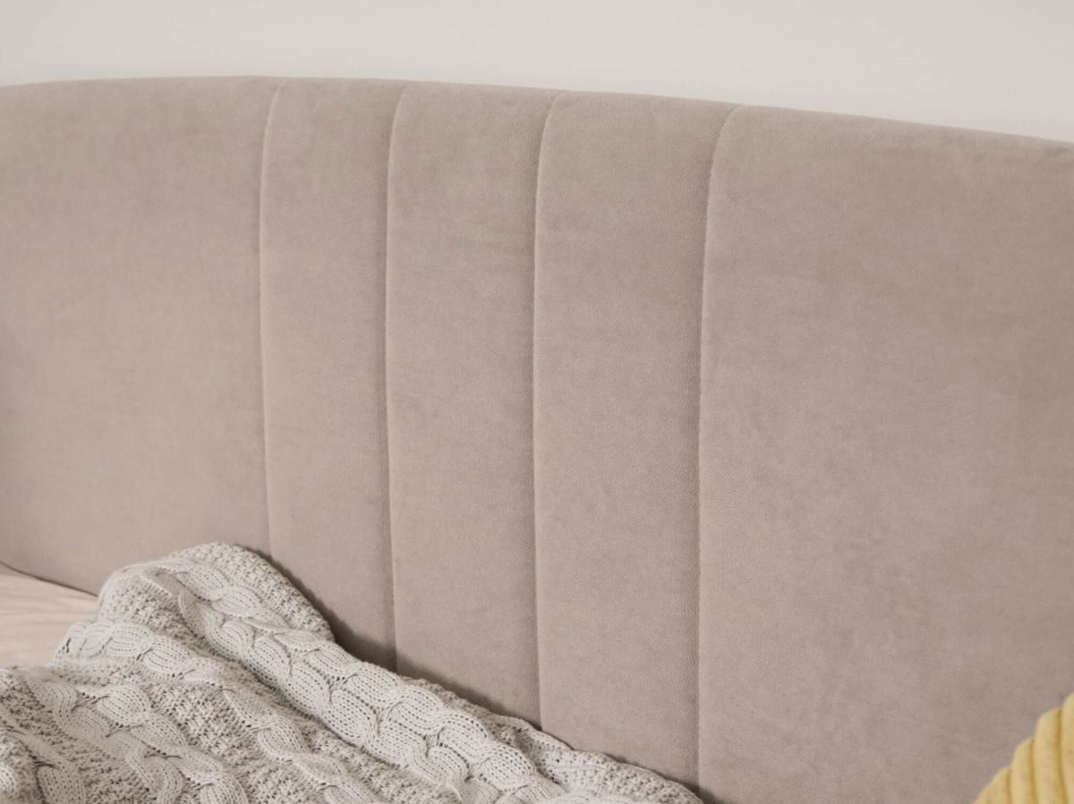 - Спинка кровати обтянута прочной и износостойкой тканью, приятной на ощупь.
