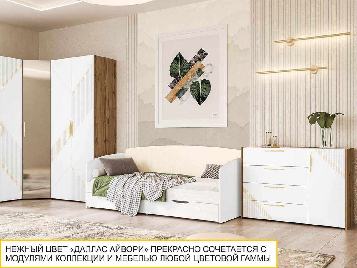 • Актуальный цвет обивки кровати «Даллас Айвори» прекрасно сочетается с модулями коллекции, а также с предметами интерьера любой другой цветовой гаммы.