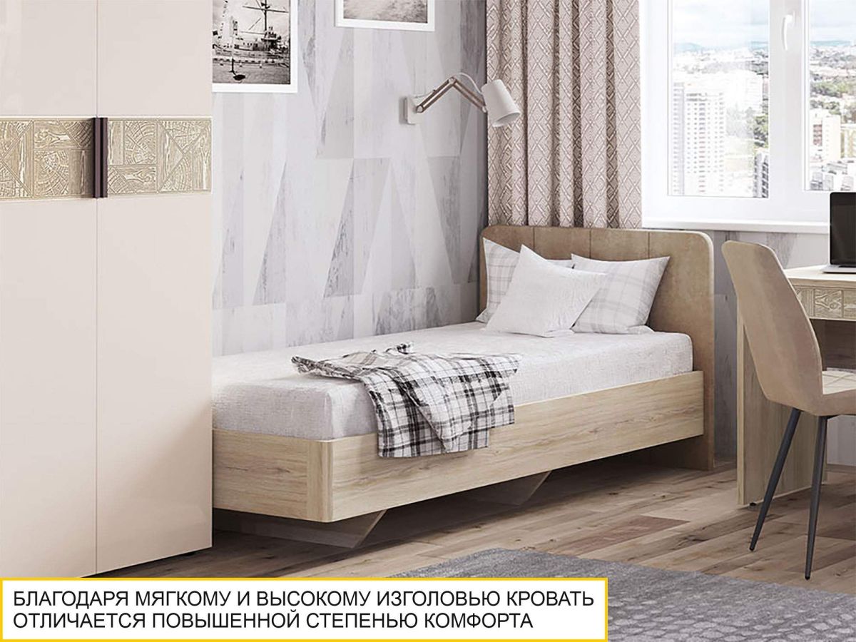 Кровать с матрасом «Кашемир 900 309» является частью модульной программы «Кашемир». Стильная и практичная модель, выполненная в натуральных кашемировых оттенках с тактильно приятными фактурами, подарит интерьеру Вашей спальни ощущение гармонии и спокойствия. Изголовье кровати выполнено из мягкого и прочного софт-велюра. Кровать можно использовать не только в сочетании с другими модулями спальни, но и как отдельный предмет мебели.