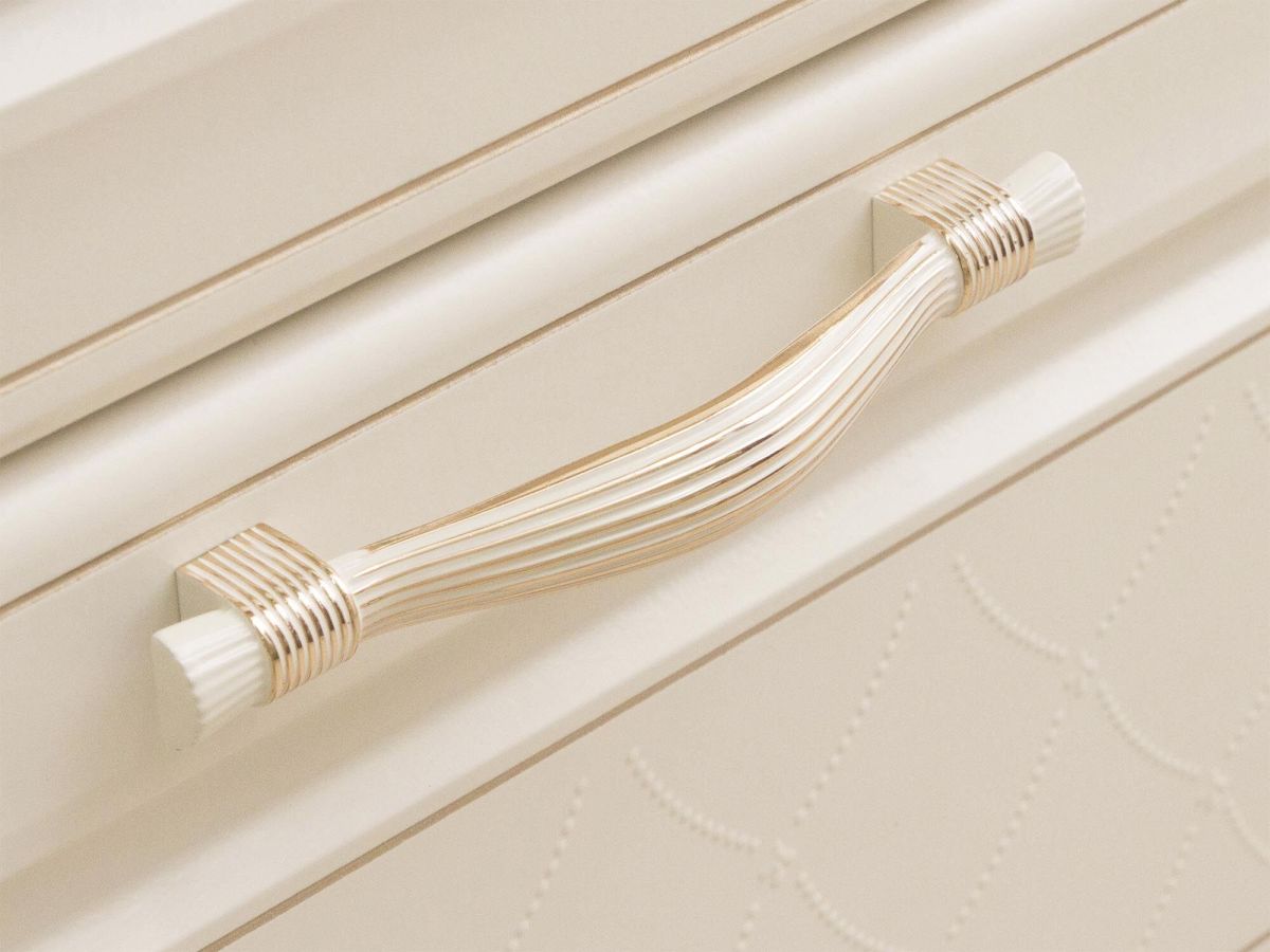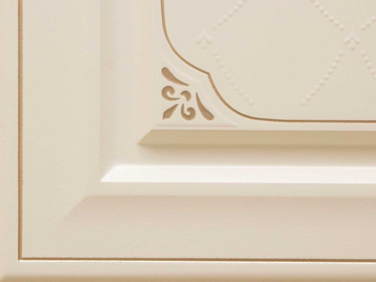 Нежный рисунок с 3D-эффектом на фасадах придаёт кухне легкость и изысканность, а рисунок патиной - благородство и дополнительный шарм.