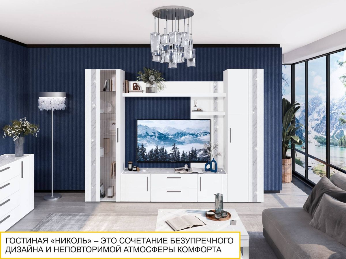Мини-гостиная «Николь 603 401» – это сочетание безупречного дизайна и неповторимой атмосферы комфорта. Белоснежные матовые фасады и нежно-серый мерцающий декор «мрамор» – визитная карточка этой коллекции. Конструктив и дизайн гостиной продуман до мелочей.