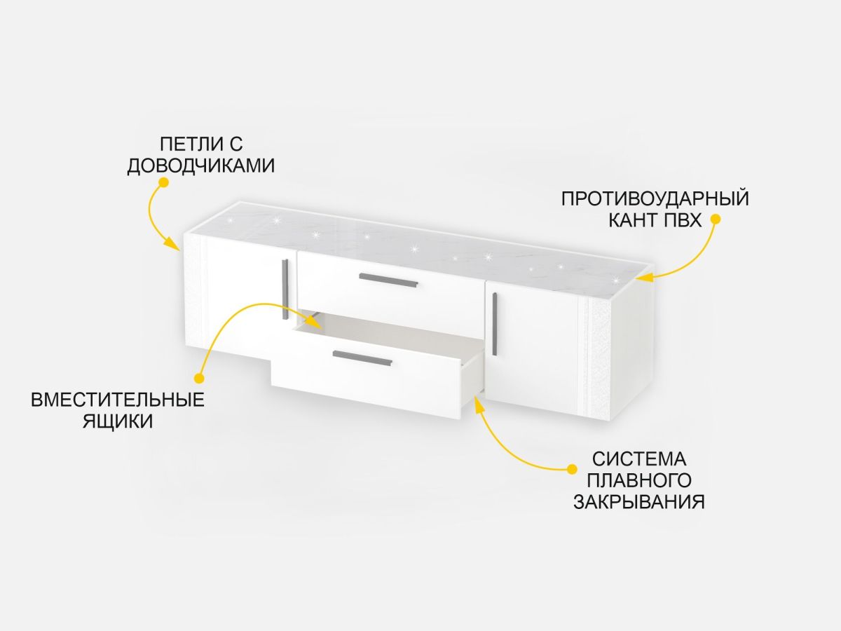 - Дверцы тумбы декорированы стильной фрезеровкой с объемным рисунком, создающим 3D-эффект. Сочетание ровной бархатистой поверхности и рельефного рисунка придает безупречный элегантный образ гостиной.