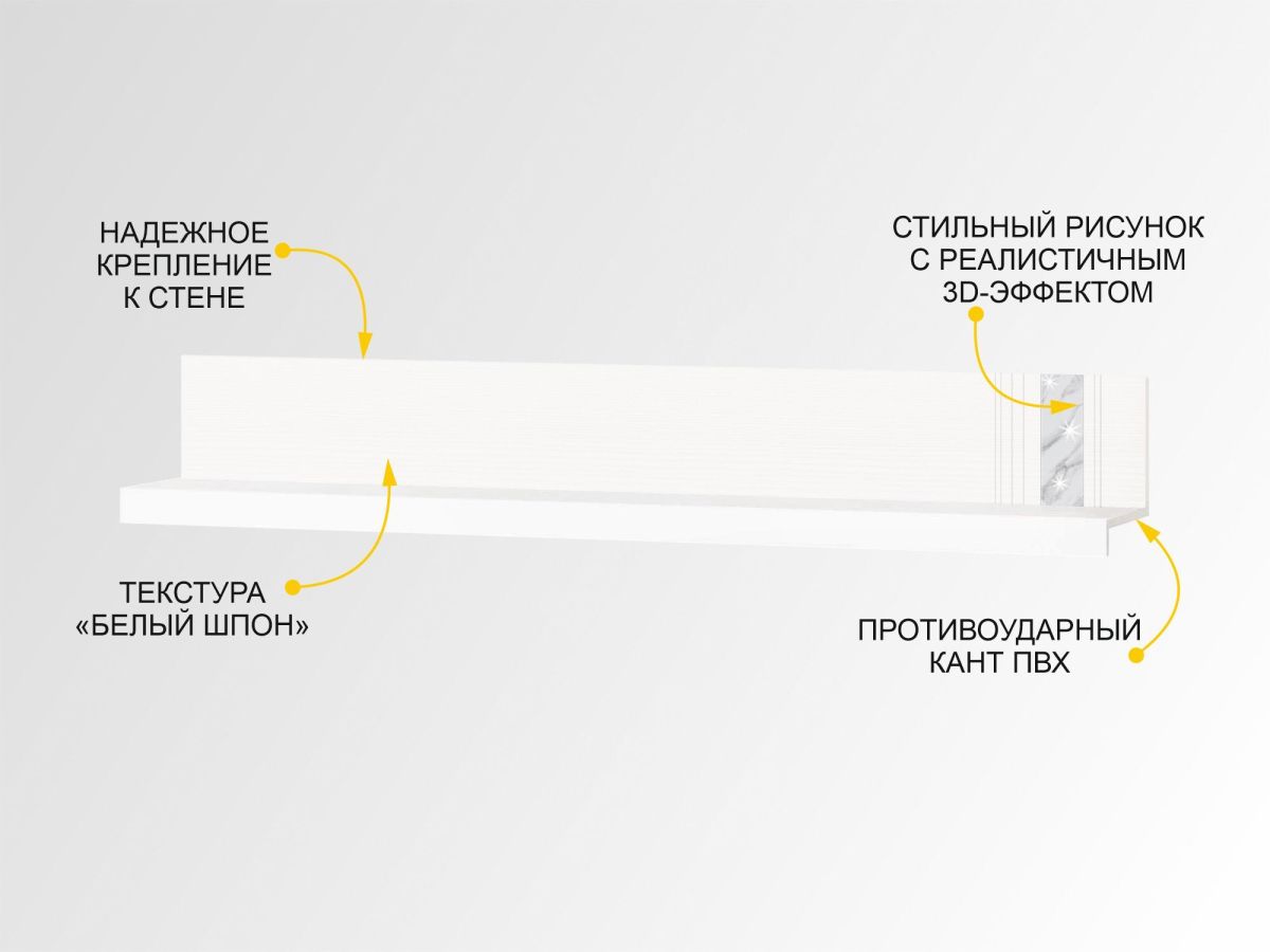 - Полка декорирована стильным мерцающим рисунком под «мрамор», который добавляет оригинальности в интерьер. Благодаря лаковому покрытию декор не стирается со временем.