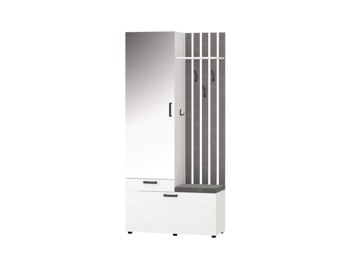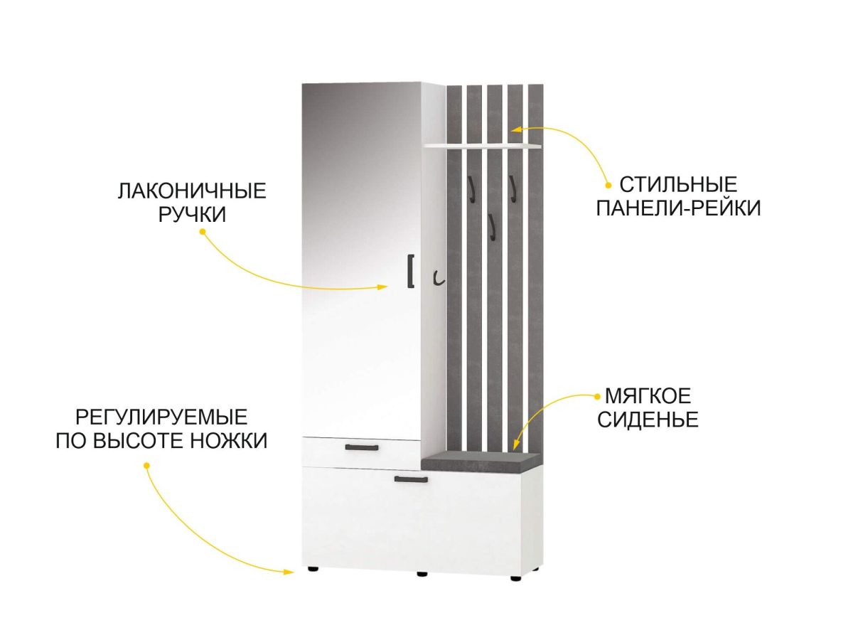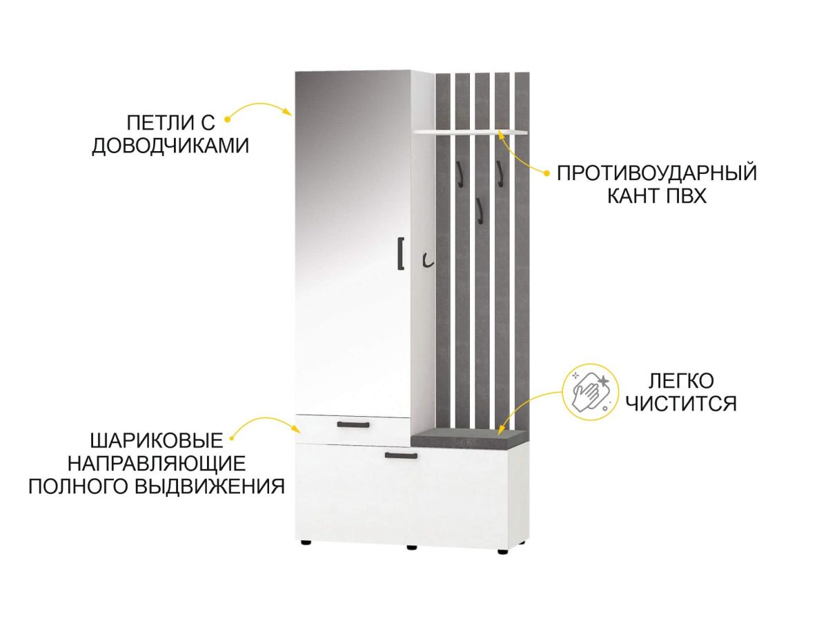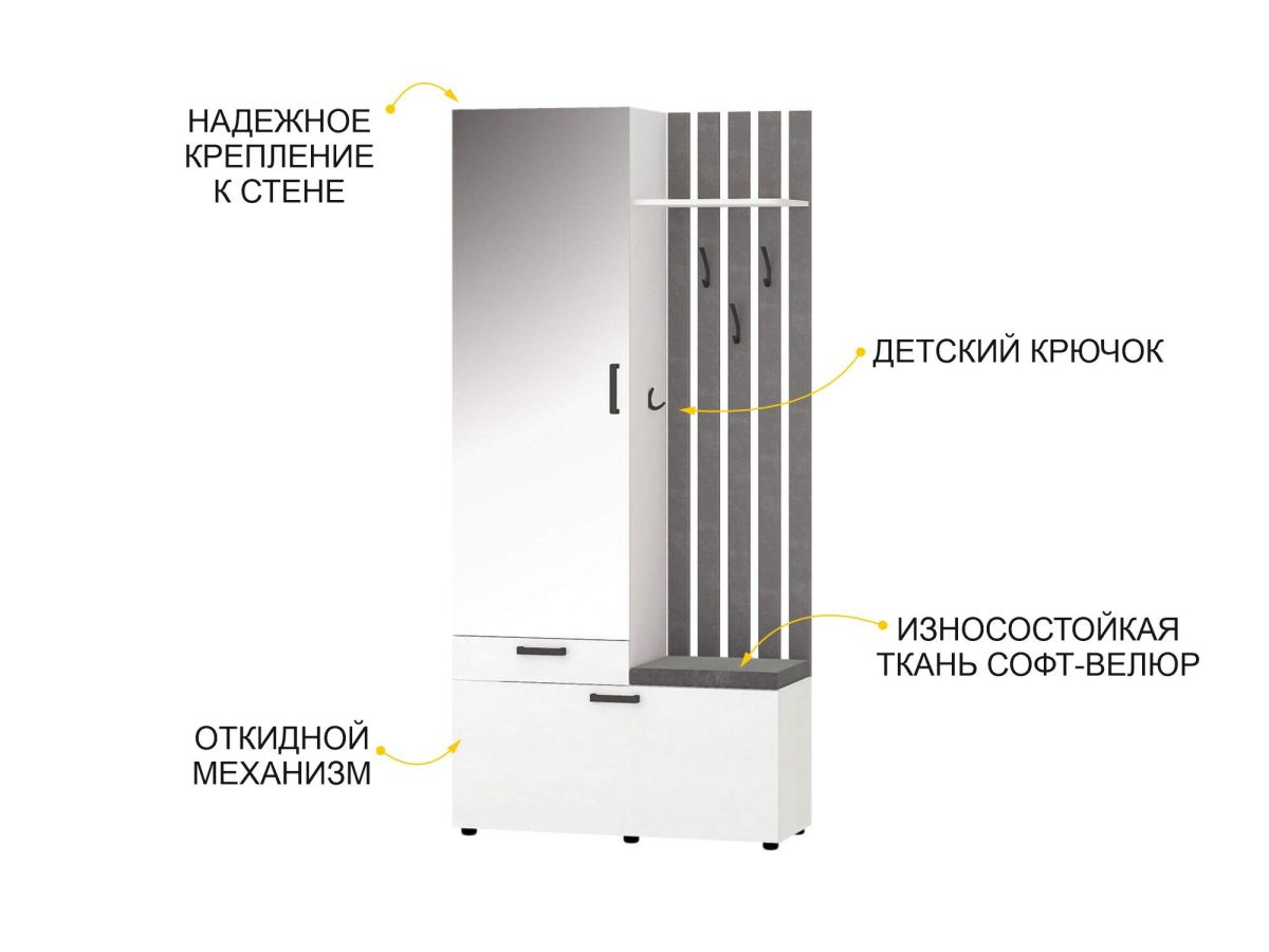 - В нижней части модуля за откидной дверцей находятся полки для обуви, в верхней части — крючки для одежды и полка для головных уборов. Встроенное мягкое сиденье обеспечивает дополнительный комфорт.