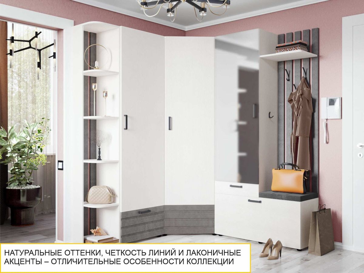 «Денвер 400» – современное решение для обустройства стильной и функциональной прихожей. Натуральные тона, правильные акценты и четкость линий – отличительные особенности коллекции. Фактура бетона на фасаде вносит элементы стиля лофт и добавляет уникальности прихожей. Модули коллекции комплектуются высококачественной фурнитурой, которая прослужит долгие годы.