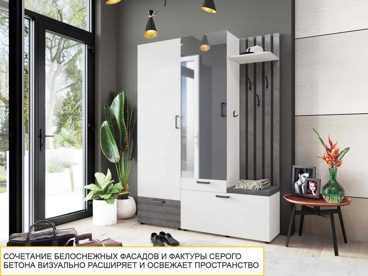 - Трендовое сочетание белоснежных фасадов с имитацией древесной текстуры и фактуры серого бетона позволяет визуально расширить пространство и сделать интерьер Вашей прихожей стильным.