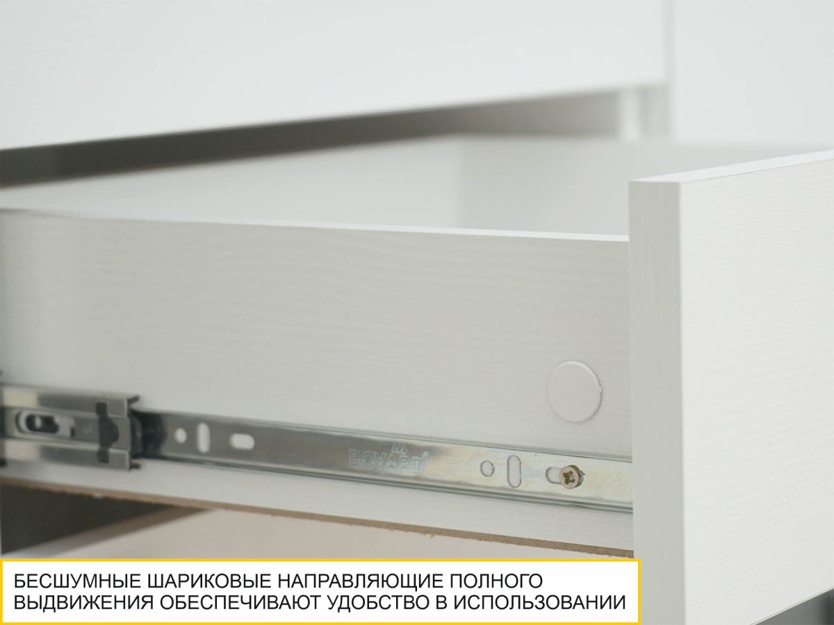 - Шариковые направляющие выдвижного ящика обеспечивают плавный бесшумный ход и длительный срок эксплуатации изделия.