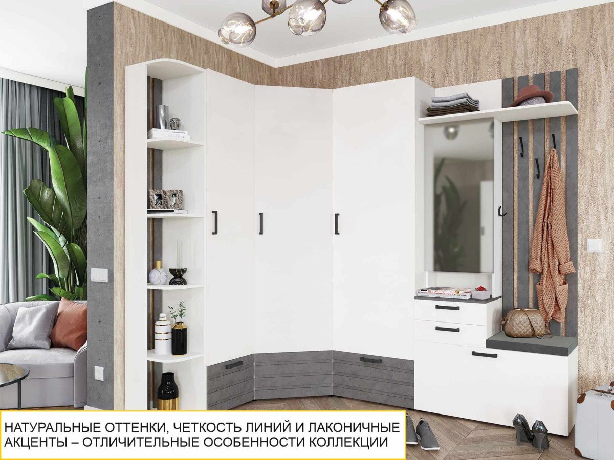 - Трендовое сочетание белоснежных фасадов с имитацией древесной текстуры и фактуры серого бетона позволяет визуально расширить пространство и сделать интерьер Вашей прихожей стильным.