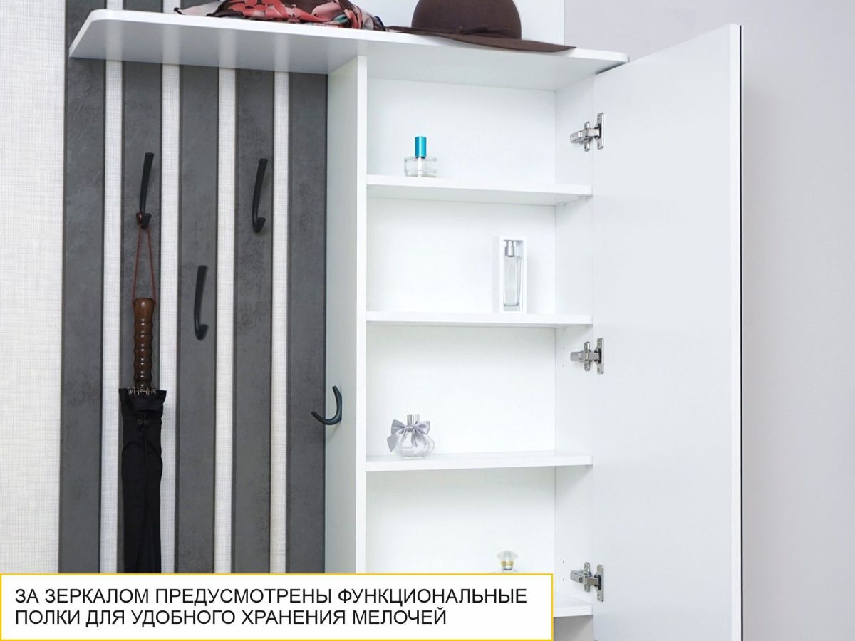 - За дверью с зеркалом предусмотрены вкладные полки для удобного хранения мелочей и аксессуаров.