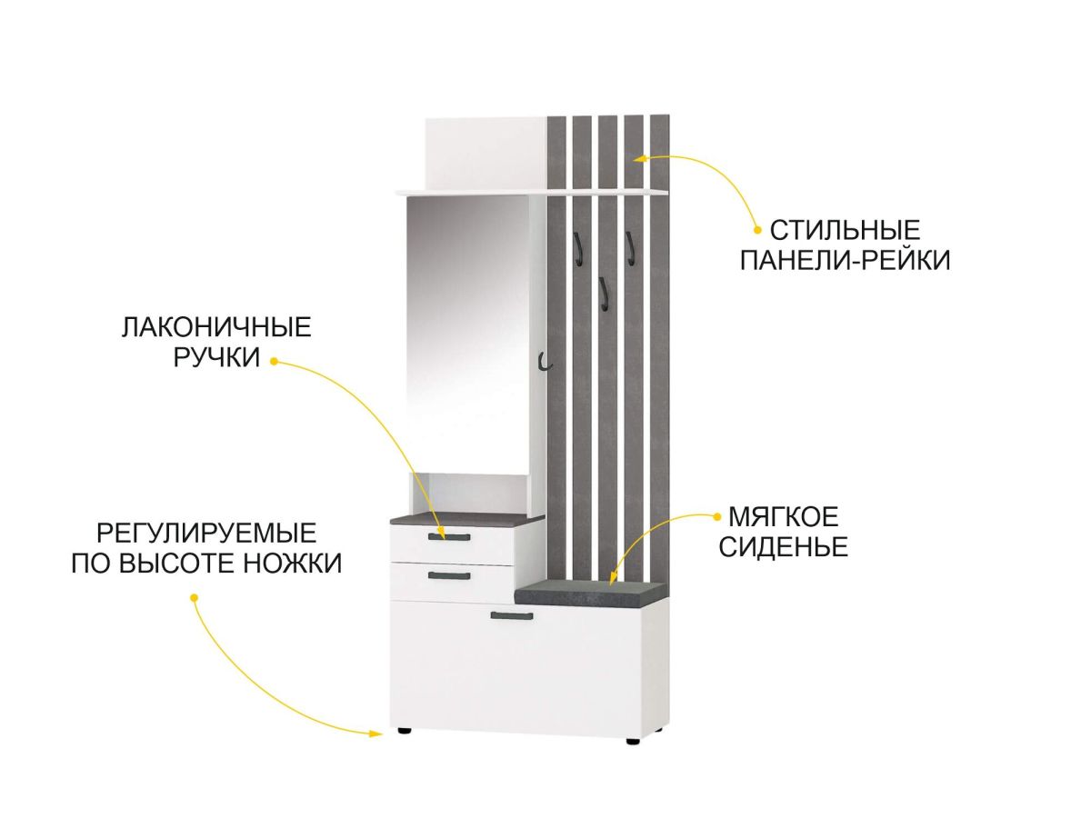 - В нижней части модуля за откидной дверцей находятся полки для обуви, в верхней части — крючки для одежды и полка для головных уборов. Встроенное мягкое сиденье обеспечивает дополнительный комфорт.