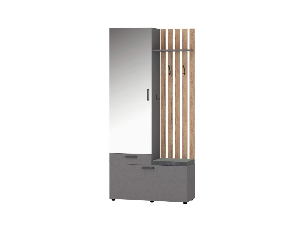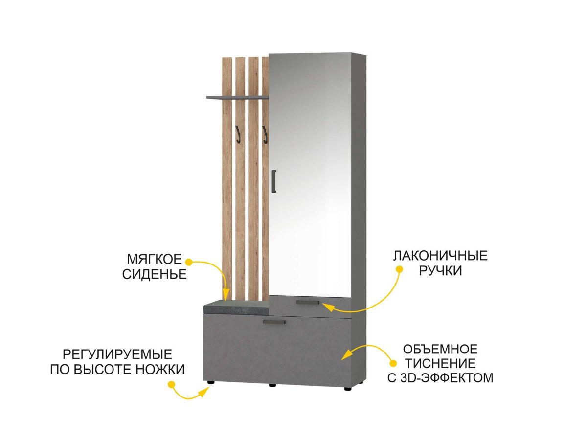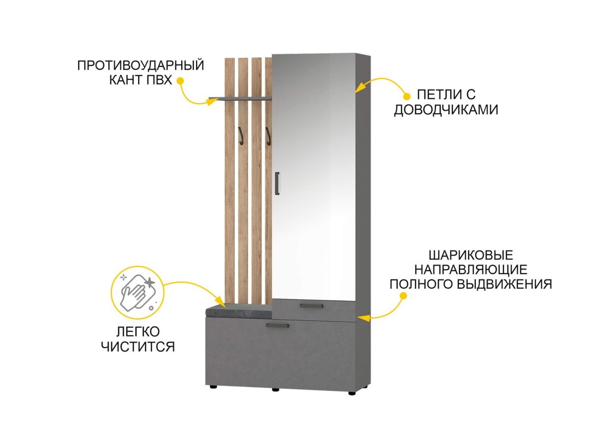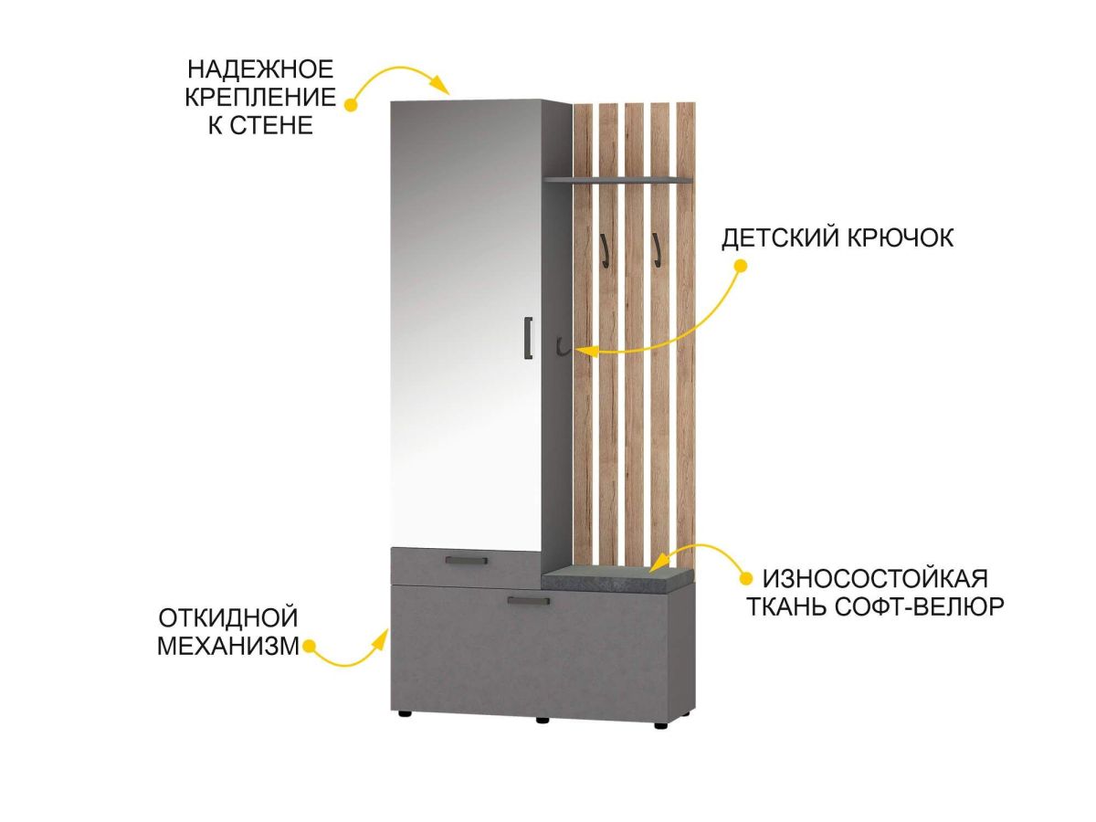 - В нижней части модуля за откидной дверцей находятся полки для обуви, в верхней части — крючки для одежды и полка для головных уборов. Встроенное мягкое сиденье обеспечивает дополнительный комфорт.