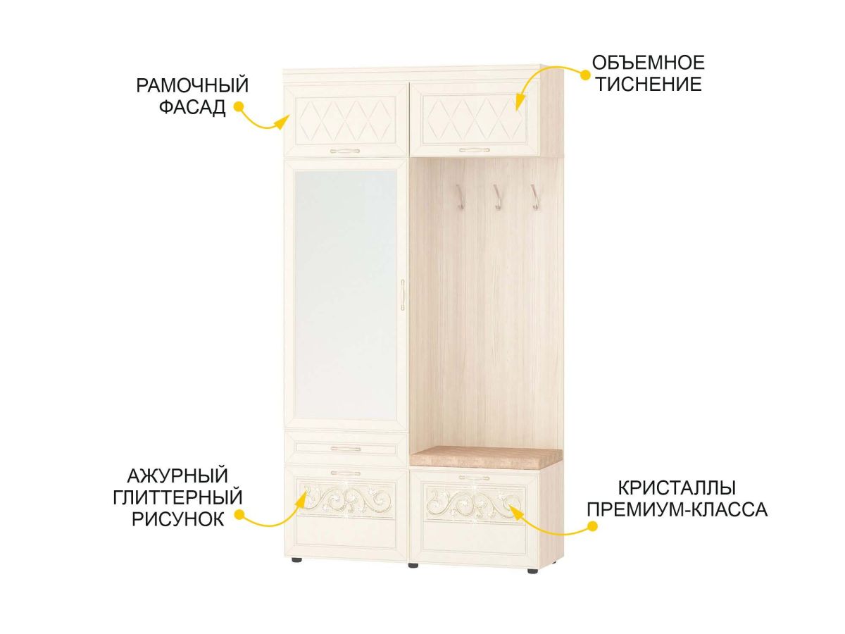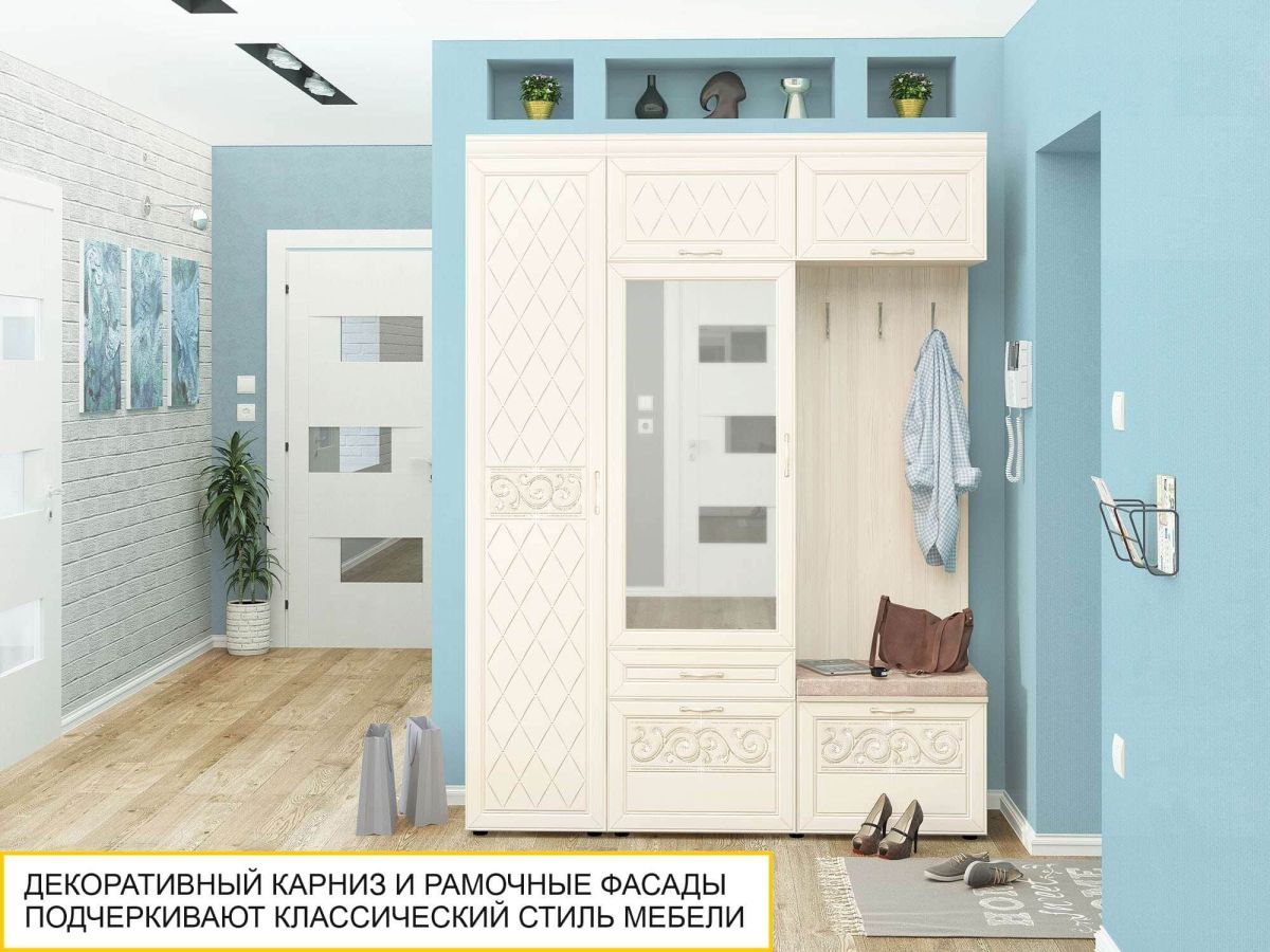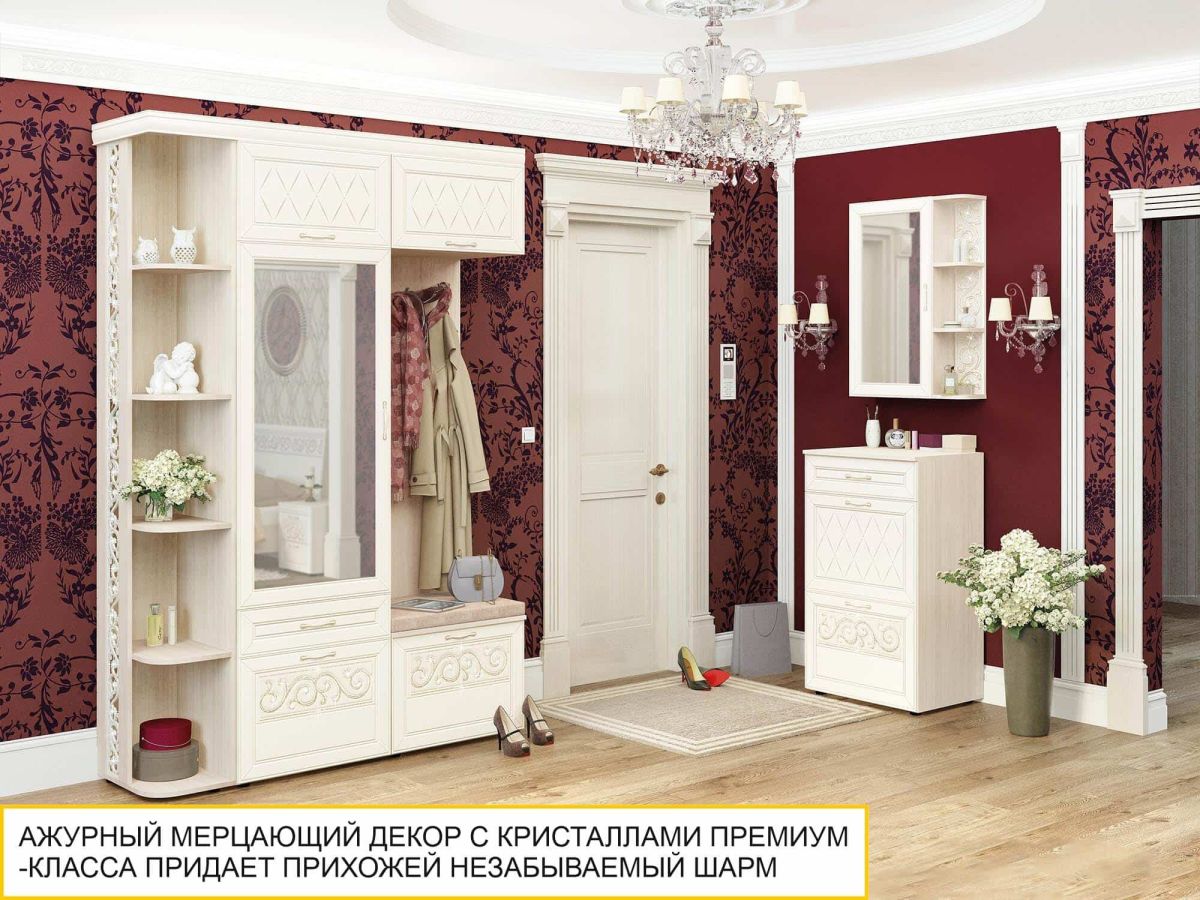 Мини-прихожая «Тиффани 47.07.1» является частью модульной программы «Тиффани». Прихожая «Тиффани» - символ классического стиля и незабываемого шарма. Нежные светлые фасады и изысканный ажурный декор с кристаллами премиум-класса – отличительная черта коллекции.