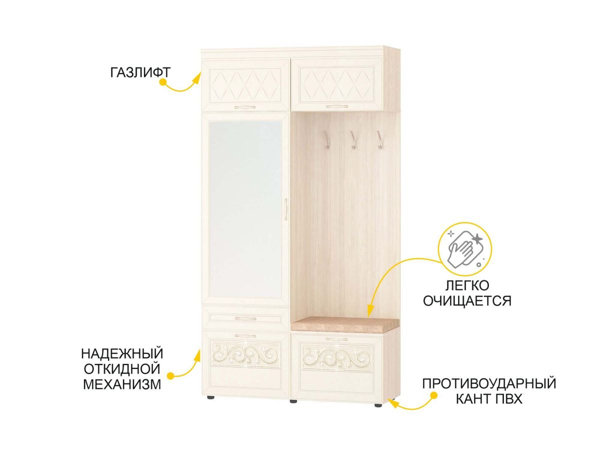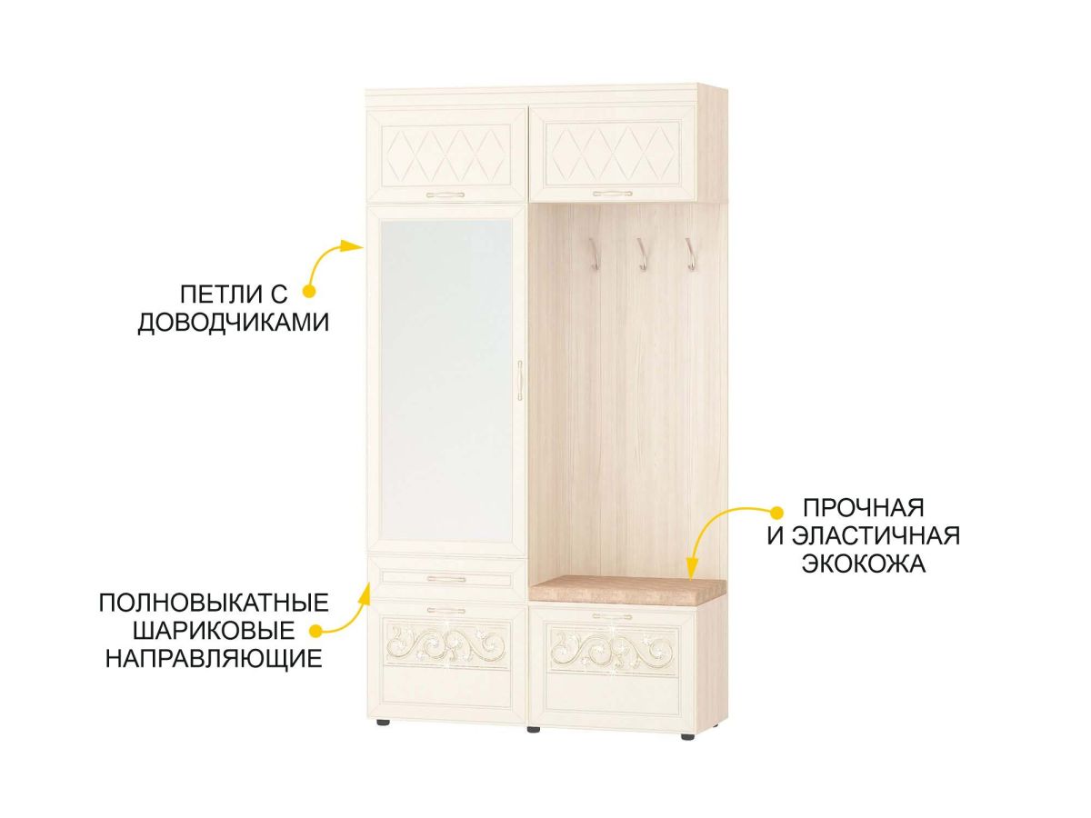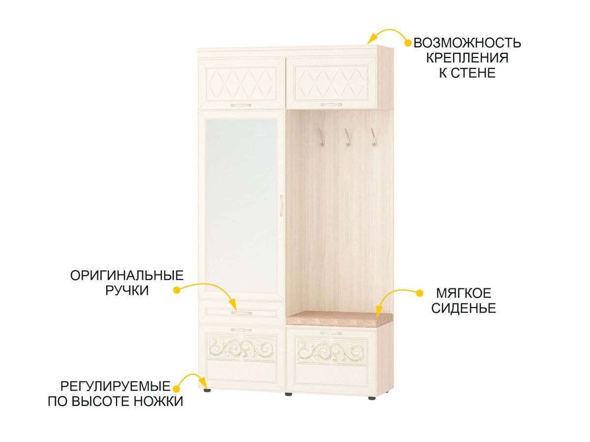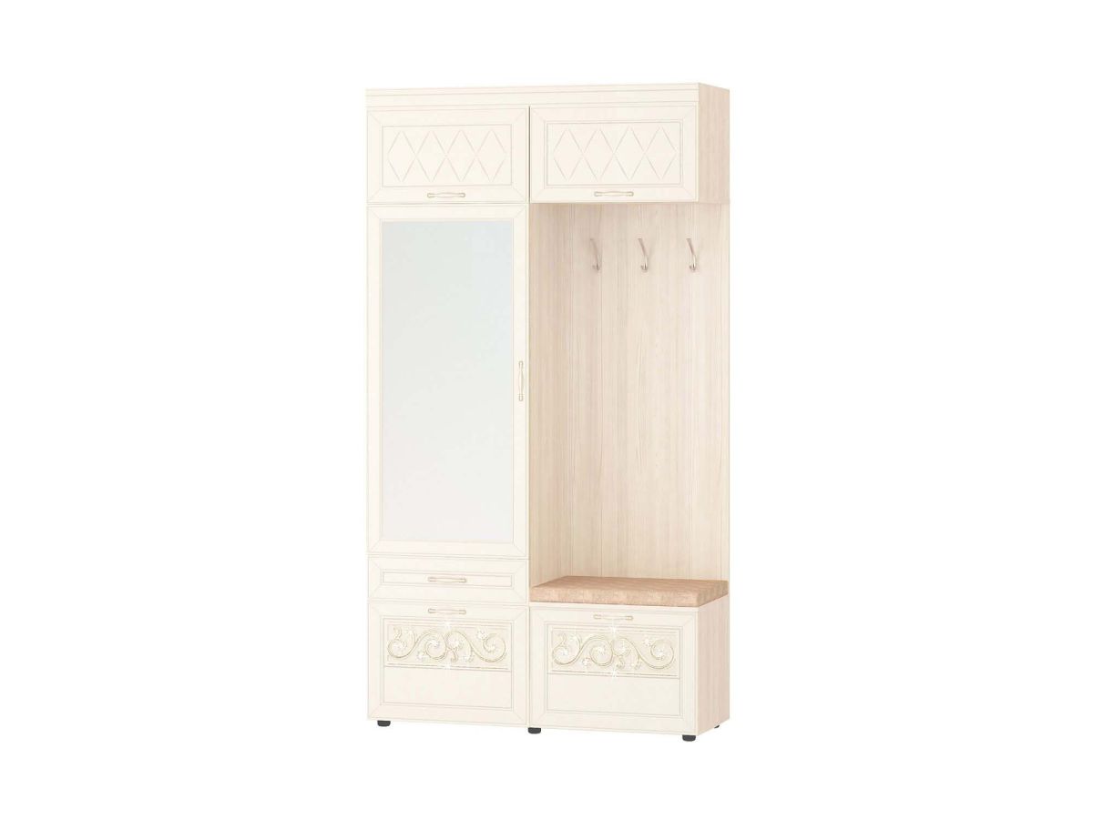 Мини-прихожая «Тиффани 47.07.1» является частью модульной программы «Тиффани». Прихожая «Тиффани» - символ классического стиля и незабываемого шарма. Нежные светлые фасады и изысканный ажурный декор с кристаллами премиум-класса – отличительная черта коллекции.