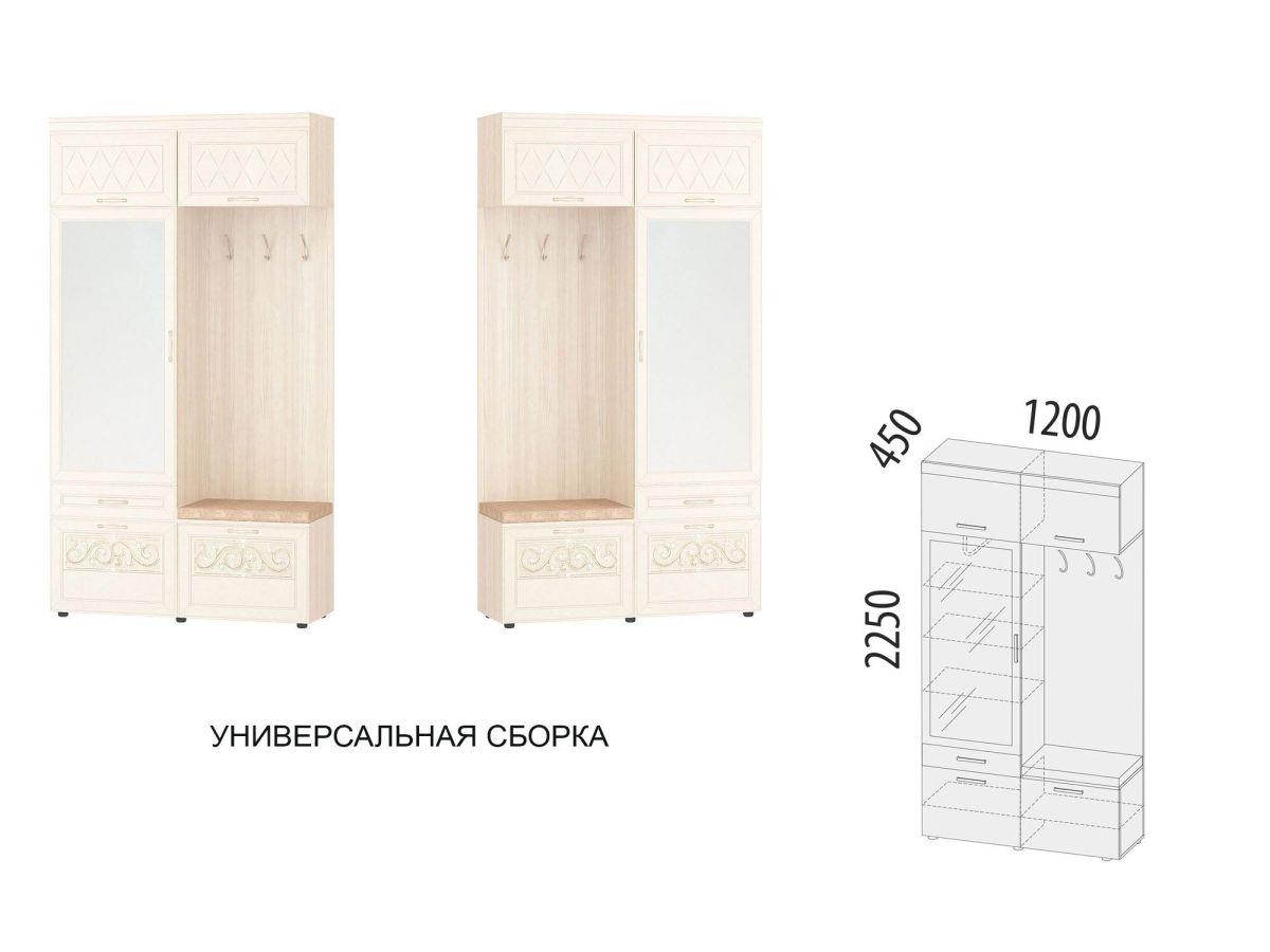 - Для установки мини-прихожей с другими шкафами коллекции можно воспользоваться межсекционными стяжками, которые идут в комплекте. Это позволит выровнять топы шкафов в одну линию и придать шкафной группе аккуратный, законченный внешний вид.