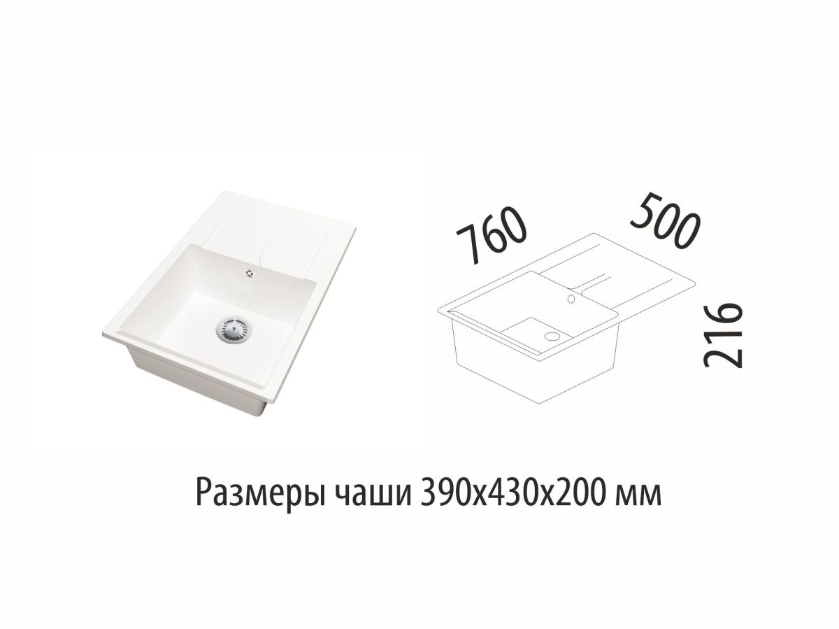 Размеры мойки - 760х500х216 мм, размеры чаши - 390х430х200 мм.
