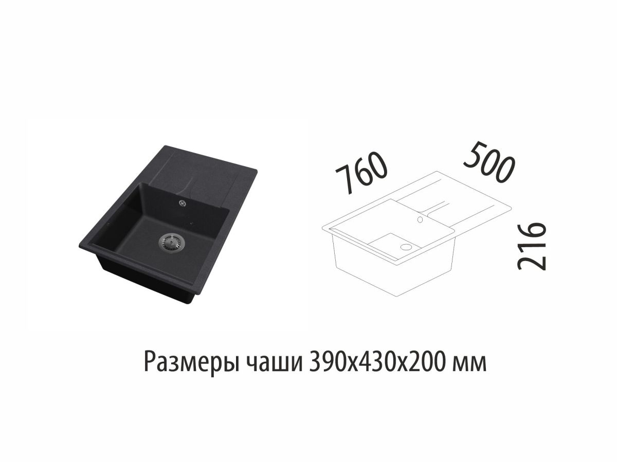 Размеры мойки - 760х500х216 мм, размеры чаши - 390х430х200 мм.