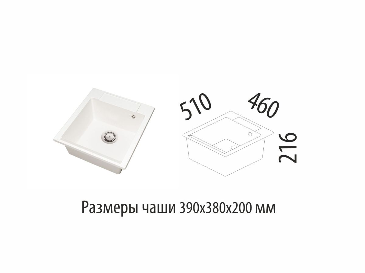 Размеры мойки - 460х510х216 мм, размеры чаши - 390х380х200 мм.