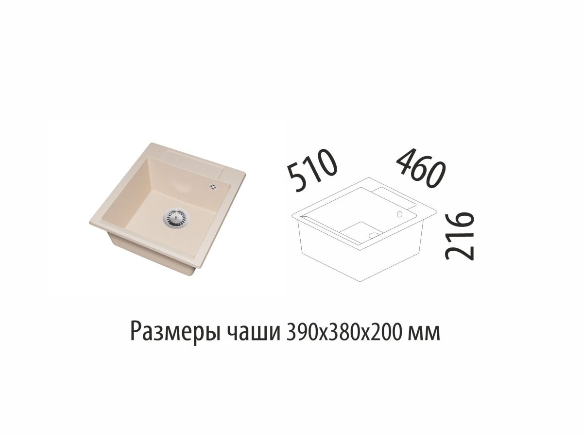 Размеры мойки - 460х510х216 мм, размеры чаши - 390х380х200 мм.