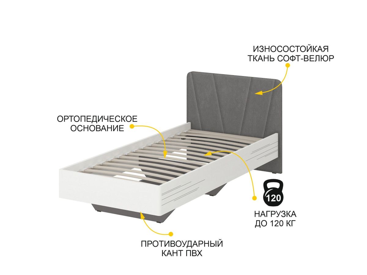 Размер спального места – 90x200 см. Конструкция кровати выдерживает максимальную равномерно распределенную нагрузку до 120 кг.