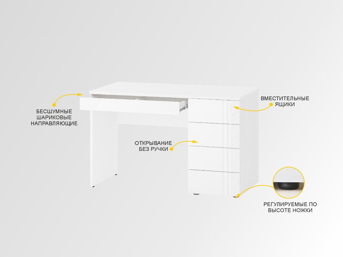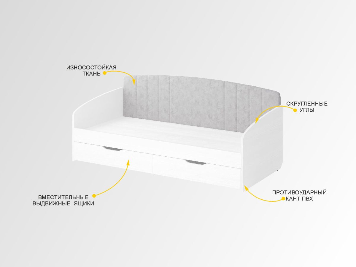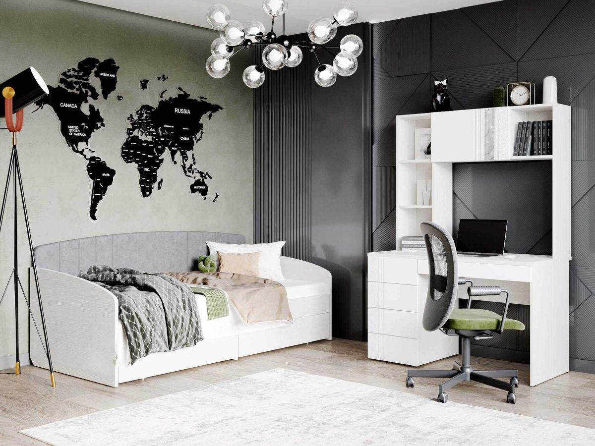 Детская «Николь» – это сочетание безупречного дизайна и неповторимой атмосферы комфорта. Белоснежный цвет и матовую поверхность фасадов дополняют лаконичный 3D-рисунок и фрезеровка. Стеклянные вставки с мраморным рисунком и деликатным мерцающим блеском привлекают внимание и подчеркивают уникальность коллекции. Изголовье кровати, выполненное из софт-велюра нежно-серого цвета, подарит интерьеру детской комнаты ощущение гармонии и спокойствия.