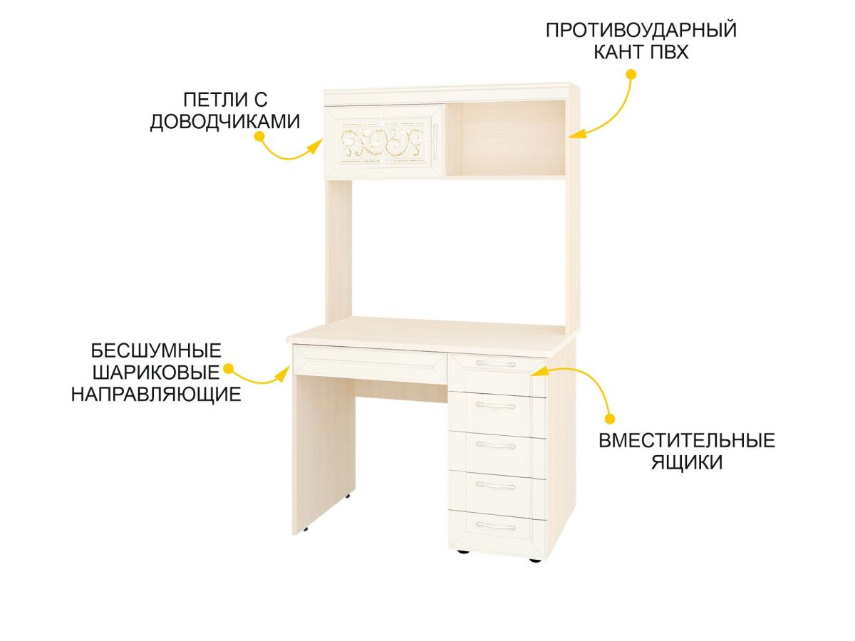 - Письменный стол с выдвижными ящиками позволяет организовать удобное рабочее пространство, а надстройка дает возможность компактно хранить большое количество необходимых рядом с рабочей зоной предметов.
