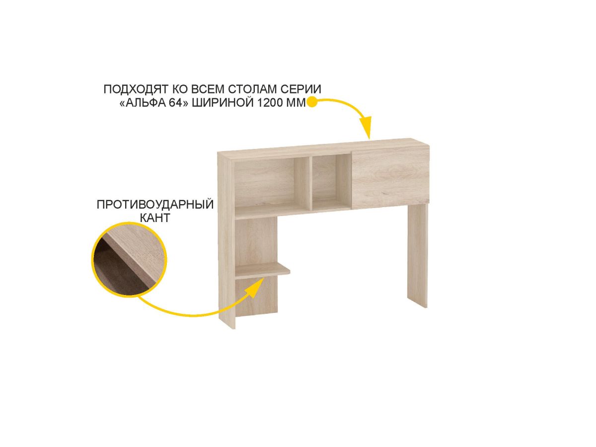 Надстройка для стола «Альфа 64.115» является частью коллекции «Альфа 64». Модуль выполнен из ЛДСП повышенной прочности в актуальном цвете Дуб «Кронберг». Надстройка позволяет компактно хранить большое количество необходимых рядом с рабочей зоной предметов. Надстройка является универсальной и может быть собрана как с правым, так и с левым открыванием дверцы. Ее можно сочетать с письменными и компьютерными столами шириной 1200 мм коллекции «Альфа 64».