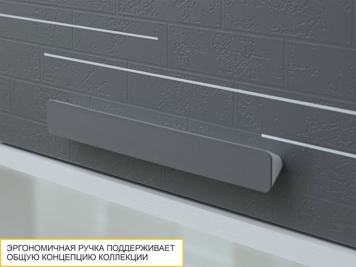 - Фасад в цвете «Графит» декорирован объемным тиснением. Рельефная текстура придает дизайну мебели выразительности, создает глубину и приятные тактильные ощущения.
