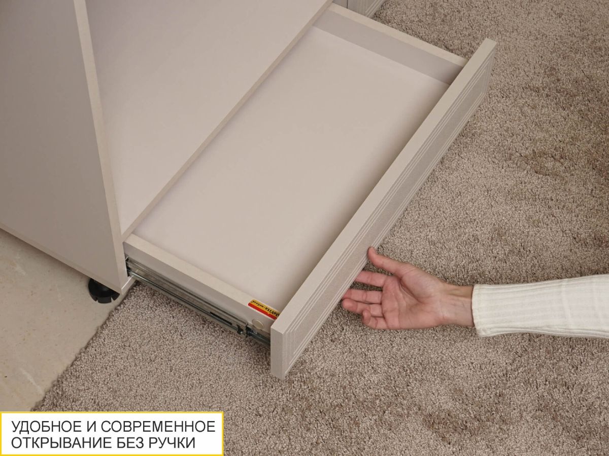 • Отсутствие лицевой фурнитуры подчеркивает современный дизайн мебели, ящик легко и удобно открывается за счет свеса фасада.