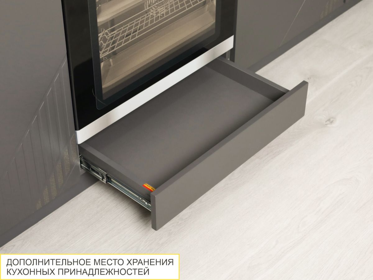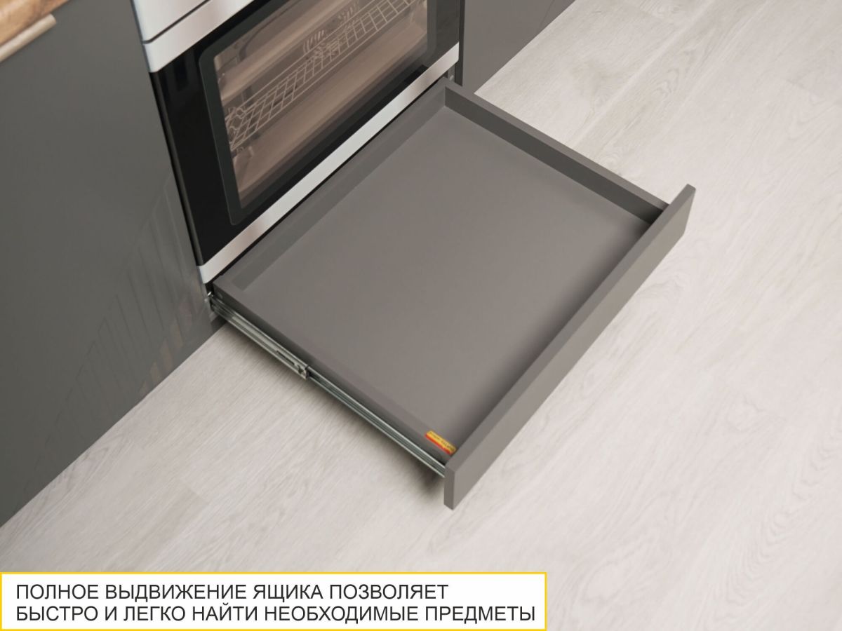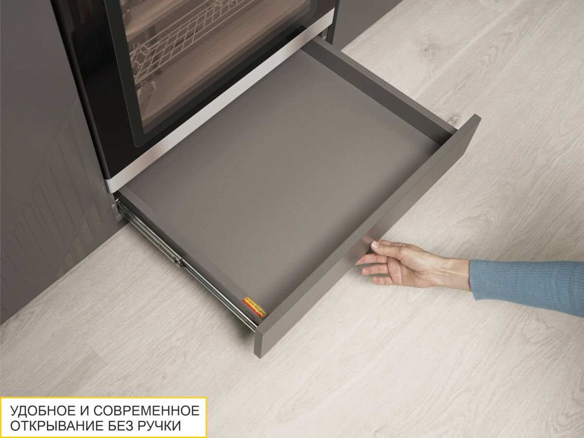 - Отсутствие лицевой фурнитуры подчеркивает современный дизайн мебели, ящик легко и удобно открывается за счет свеса фасада.