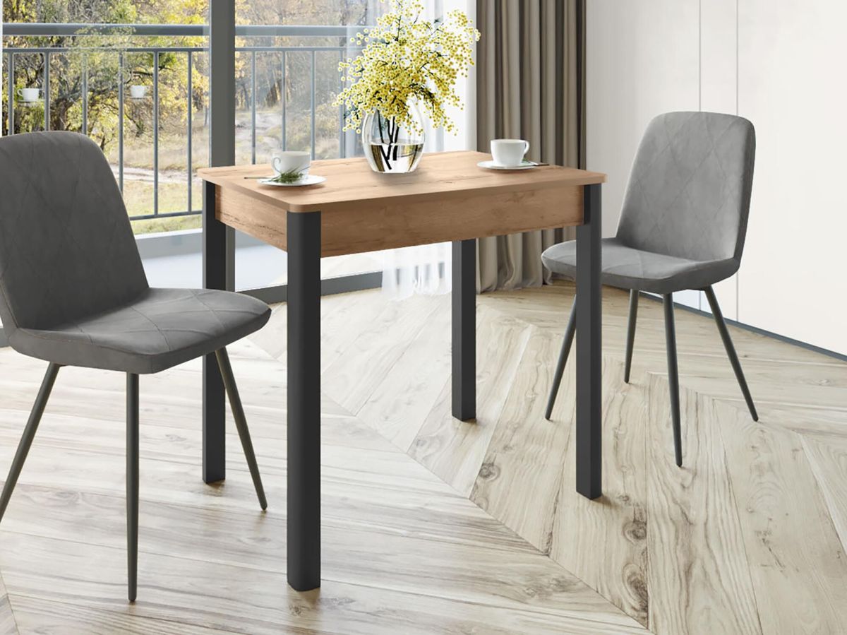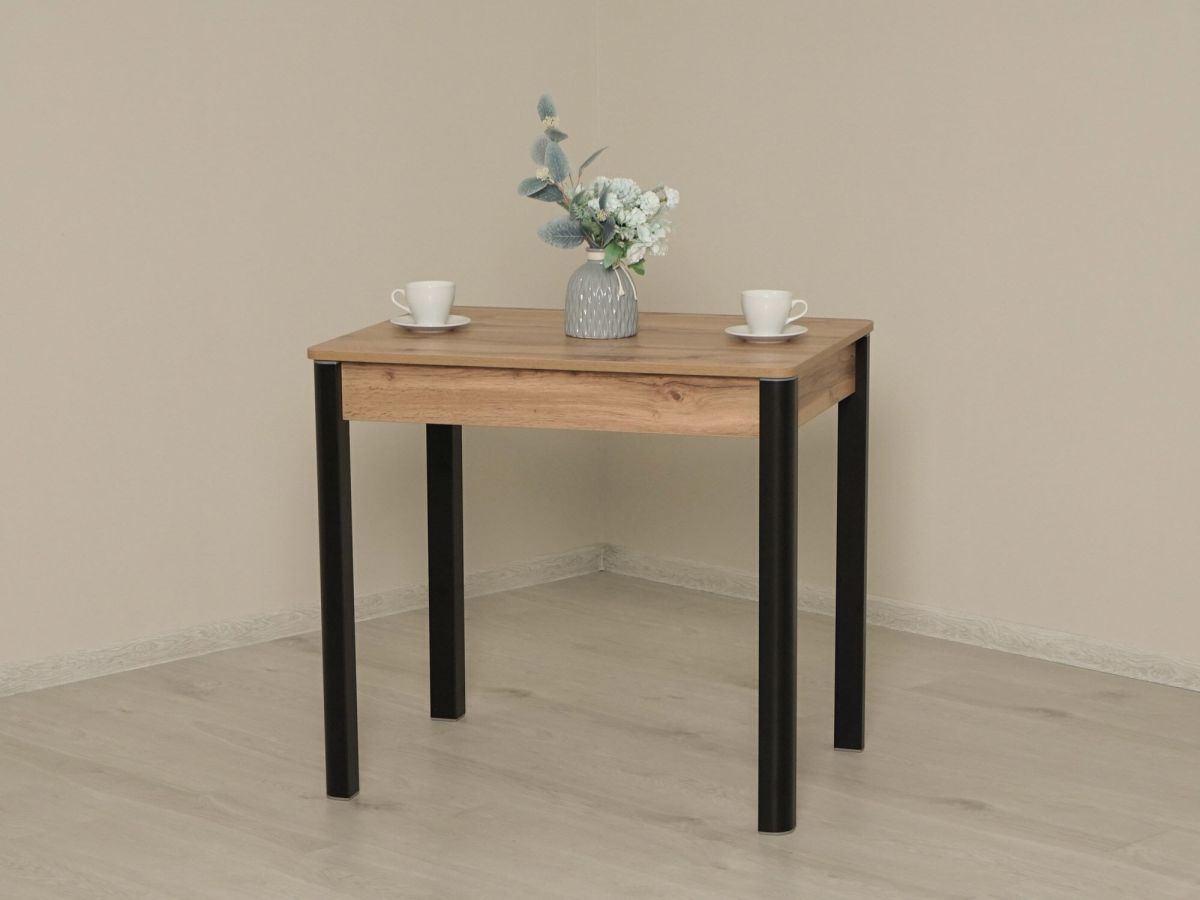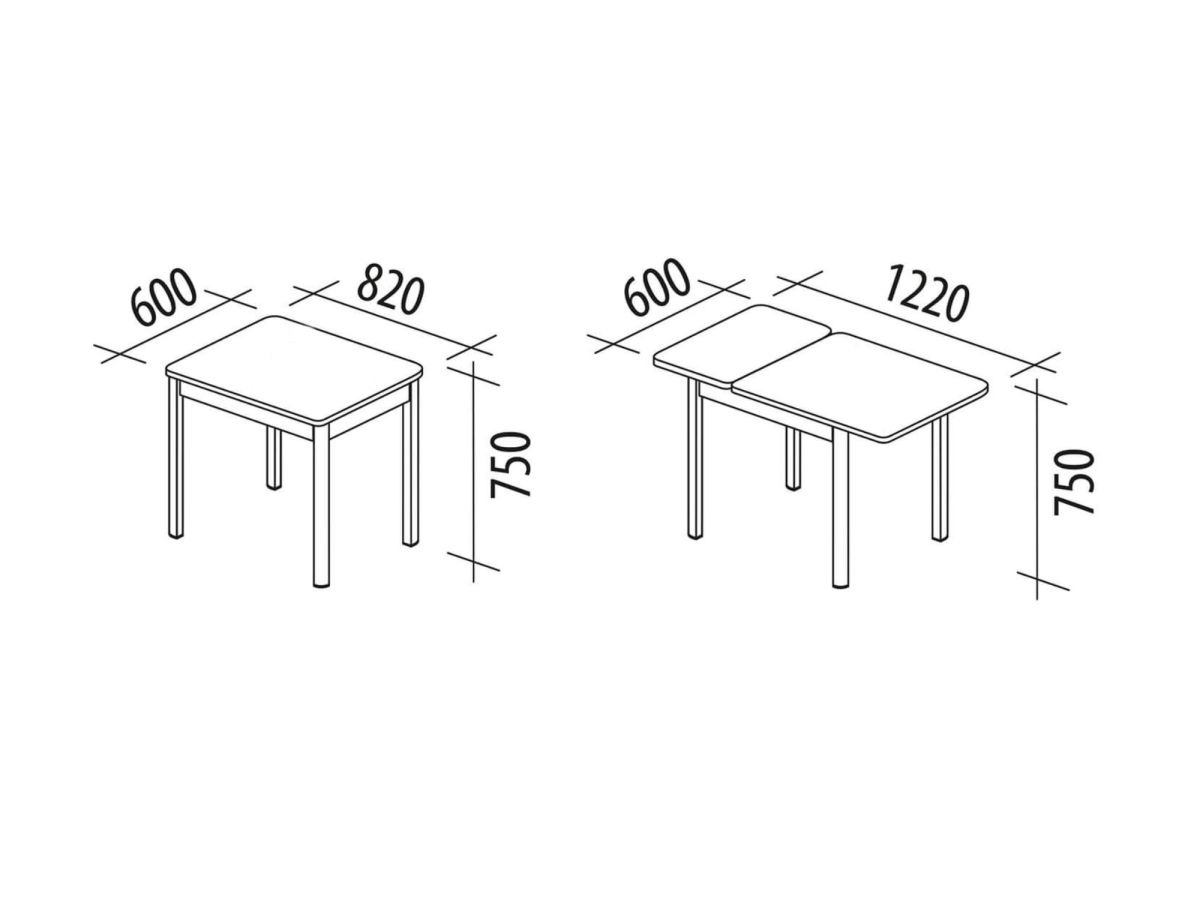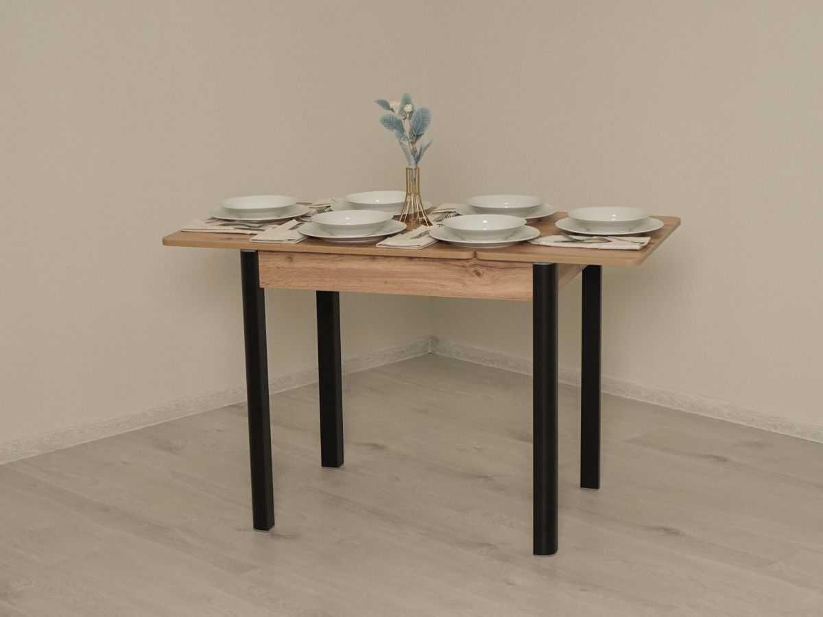 Теплый оттенок натурального дерева создает уютную атмосферу, а контрастные металлические опоры черного цвета подчеркивают современный дизайн изделия. В сложенном виде размер стола – 82х60 см, в разложенном – 122х60 см; высота стола 75 см.