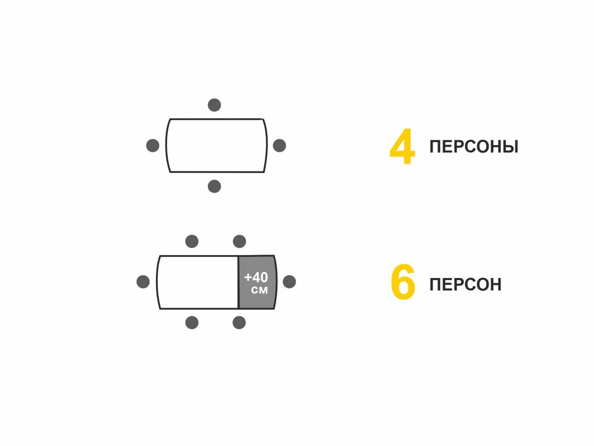 - За одну цену Вы фактически покупаете 2 обеденных стола – один компактный для 4 персон и один с увеличенной столешницей на 6 персон.