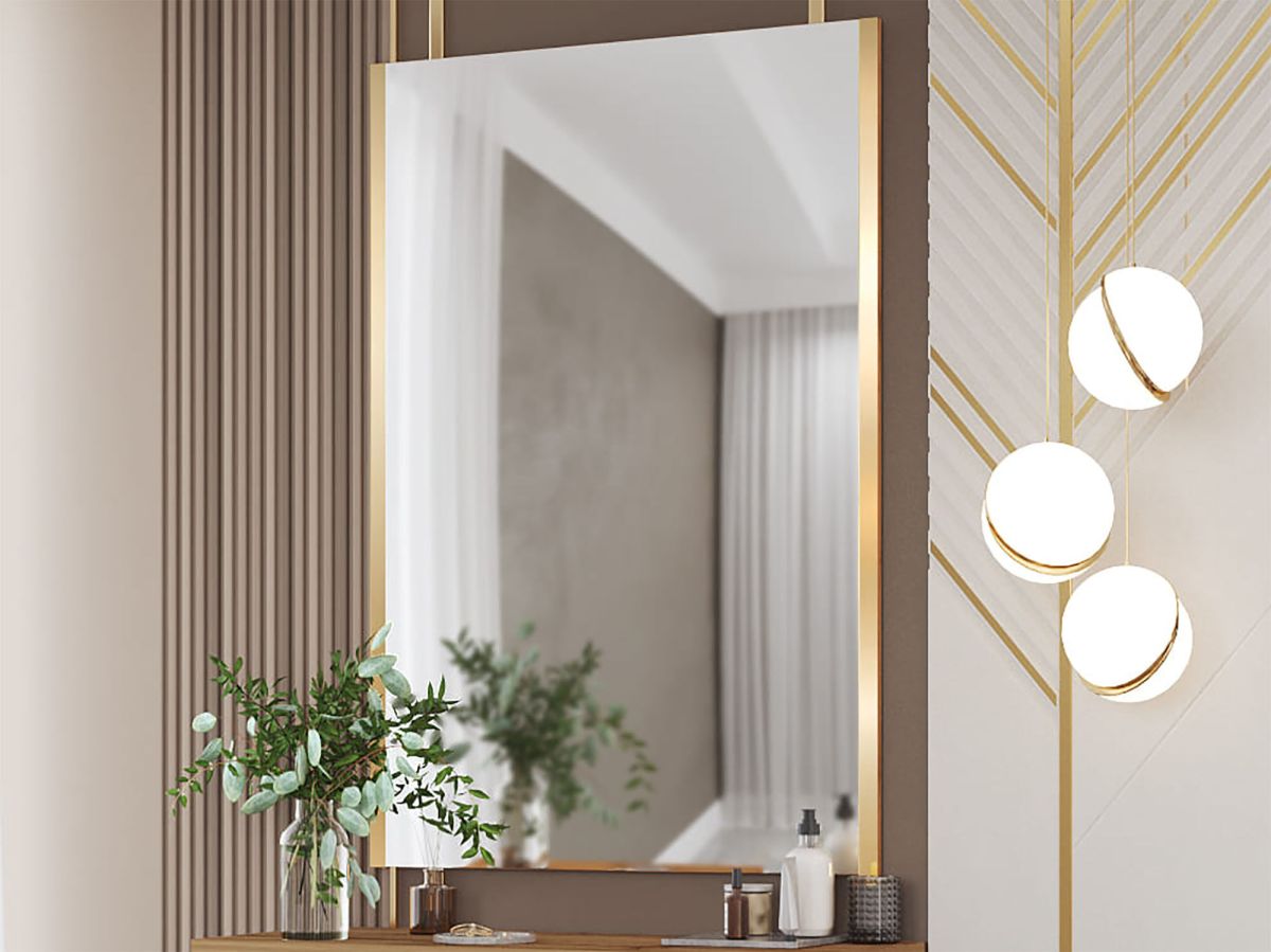 - Зеркальное полотно декорировано металлизированным кантом с эффектом шлифованного золота, что подчеркивает утонченный внешний вид изделия. Покрытие на элементе устойчиво к истиранию и не тускнеет со временем.
