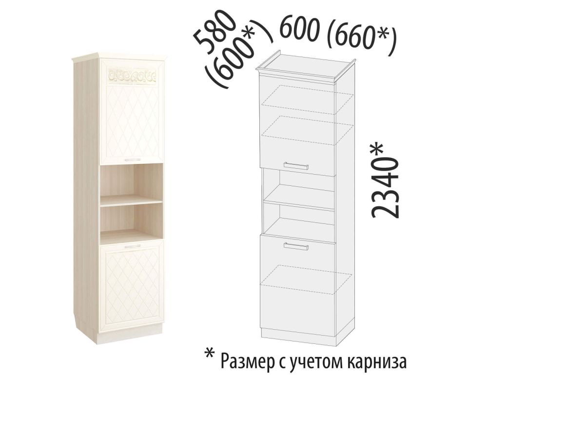 Пенал «Тиффани 19.75» является частью модульного набора для кухни «Тиффани». Плавное закрывание дверок обеспечивается петлями с доводчиками. Модуль является универсальным и может быть собран как с левым, так и с правым открыванием дверок. Предусмотрено семь уровней размещения вкладной полки с шагом 32 мм. Если убрать вкладную полку, то в открытую нишу пенала можно встроить духовой шкаф. Без вкладной полки внутренние габариты открытой ниши составляют: ширина — 570 мм, глубина — 550 мм, высота — 600 мм.