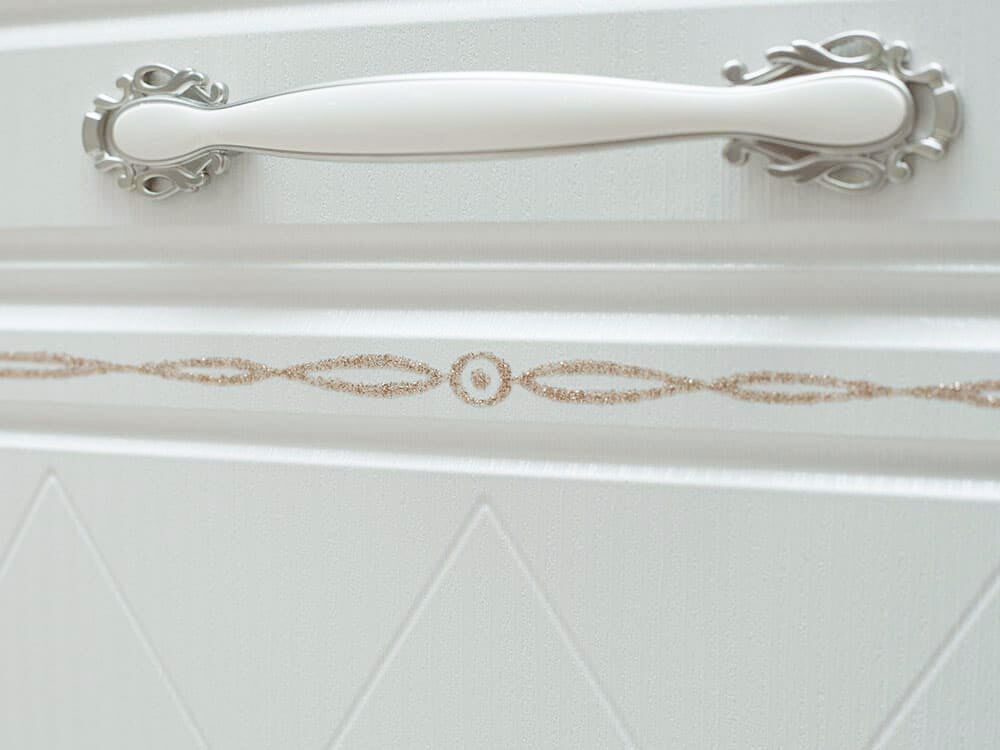 Глиттерный рисунок на фасадах с изящными гнутыми ручками придает кухне изысканный внешний вид. Ширина и глубина изделия без учета карниза – 600x580 мм. Ширина и глубина изделия с учетом карниза – 660x600 мм.