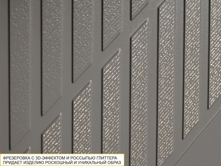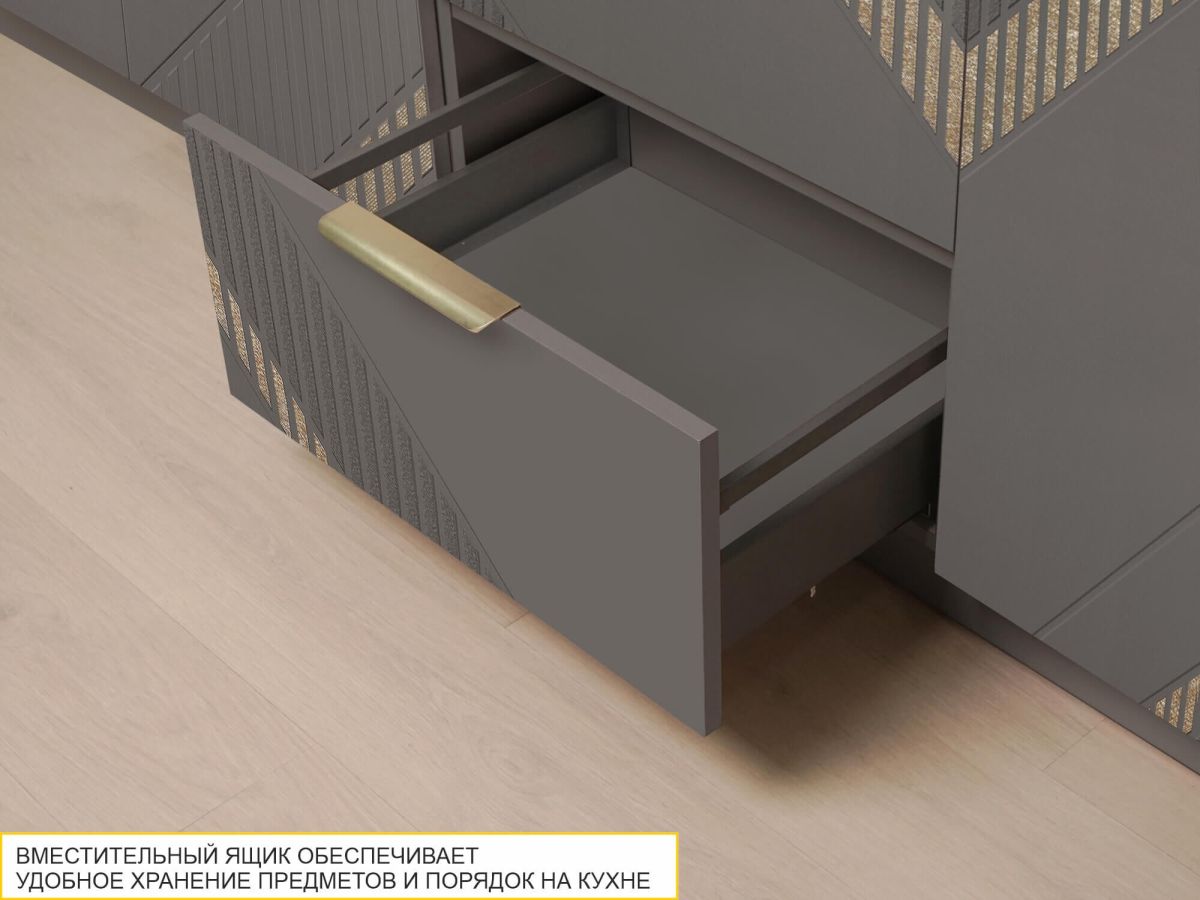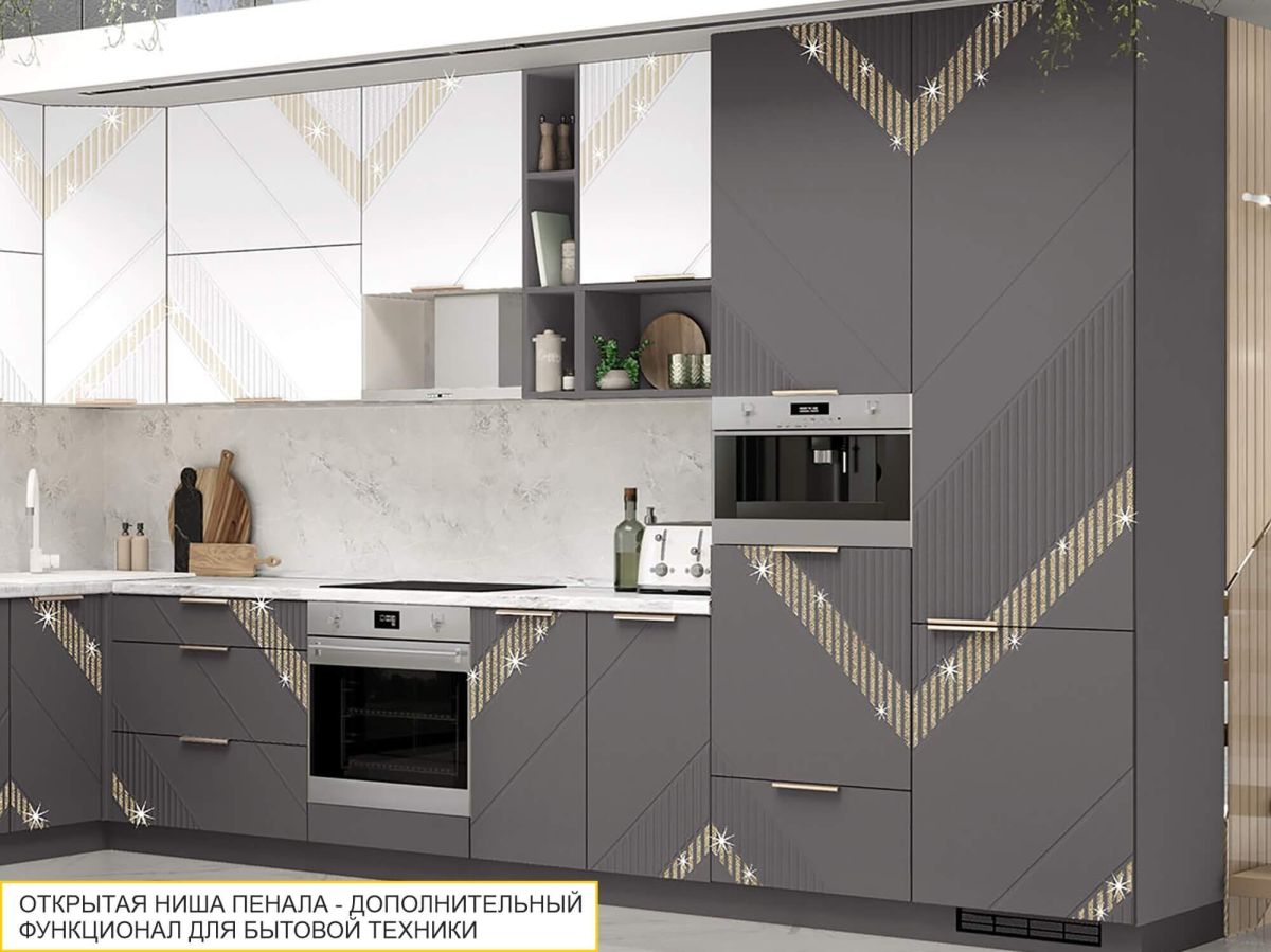 Коллекция «Монако» - это образец элегантного стиля и утонченного вкуса. Эффектная фрезеровка с объемным 3D-рисунком и россыпью глиттера подчеркивает эксклюзивный и уникальный вид изделия. Фасады выполнены в насыщенном цвете «Графит», который добавляет кухне глубины и контраста, подчеркивая элегантность дизайна. Благодаря сочетанию строгих линий и текстур кухня выглядит стильно, дорого и современно.