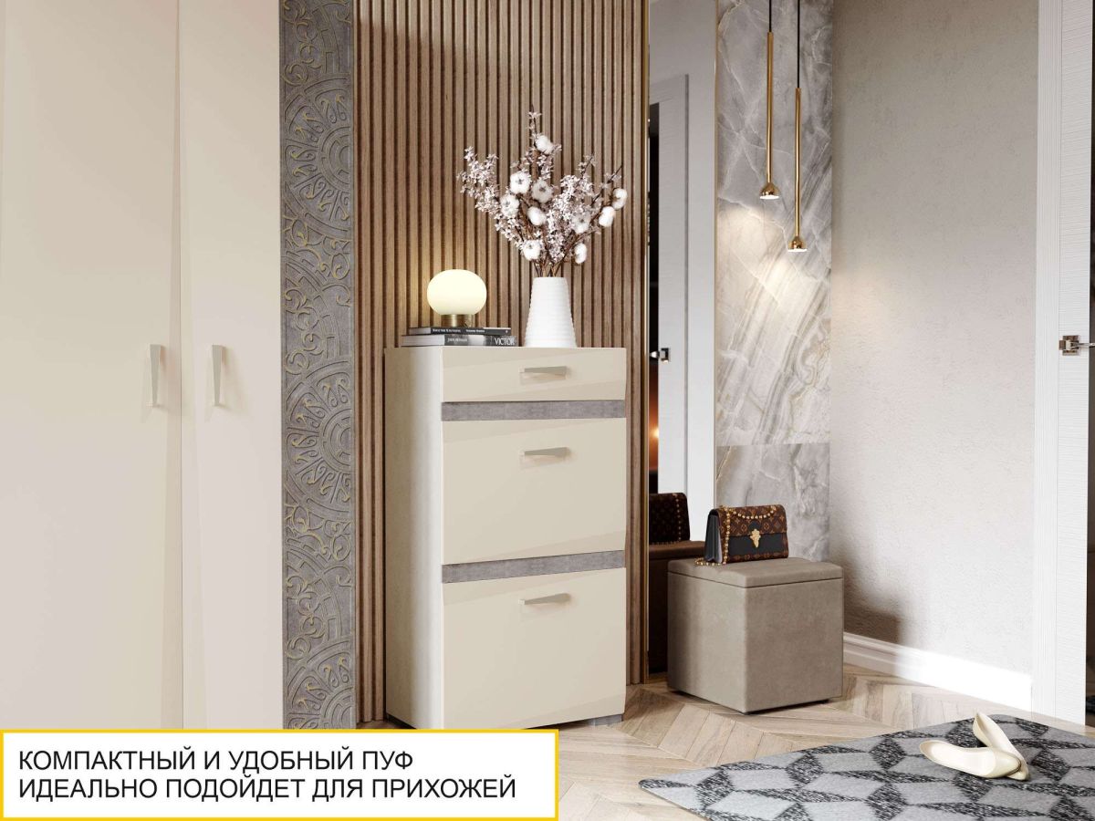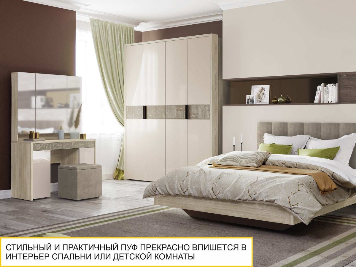 Пуф «Кашемир 900.90» – является частью модульной программы «Кашемир». Стильный и практичный пуф мягкого трюфельного цвета прекрасно впишется в интерьер спальни, прихожей или детской комнаты. Модель отличается высоким качеством и особым комфортом. Пуф можно использовать не только в сочетании с другими модулями спальни, но и как отдельный предмет мебели.