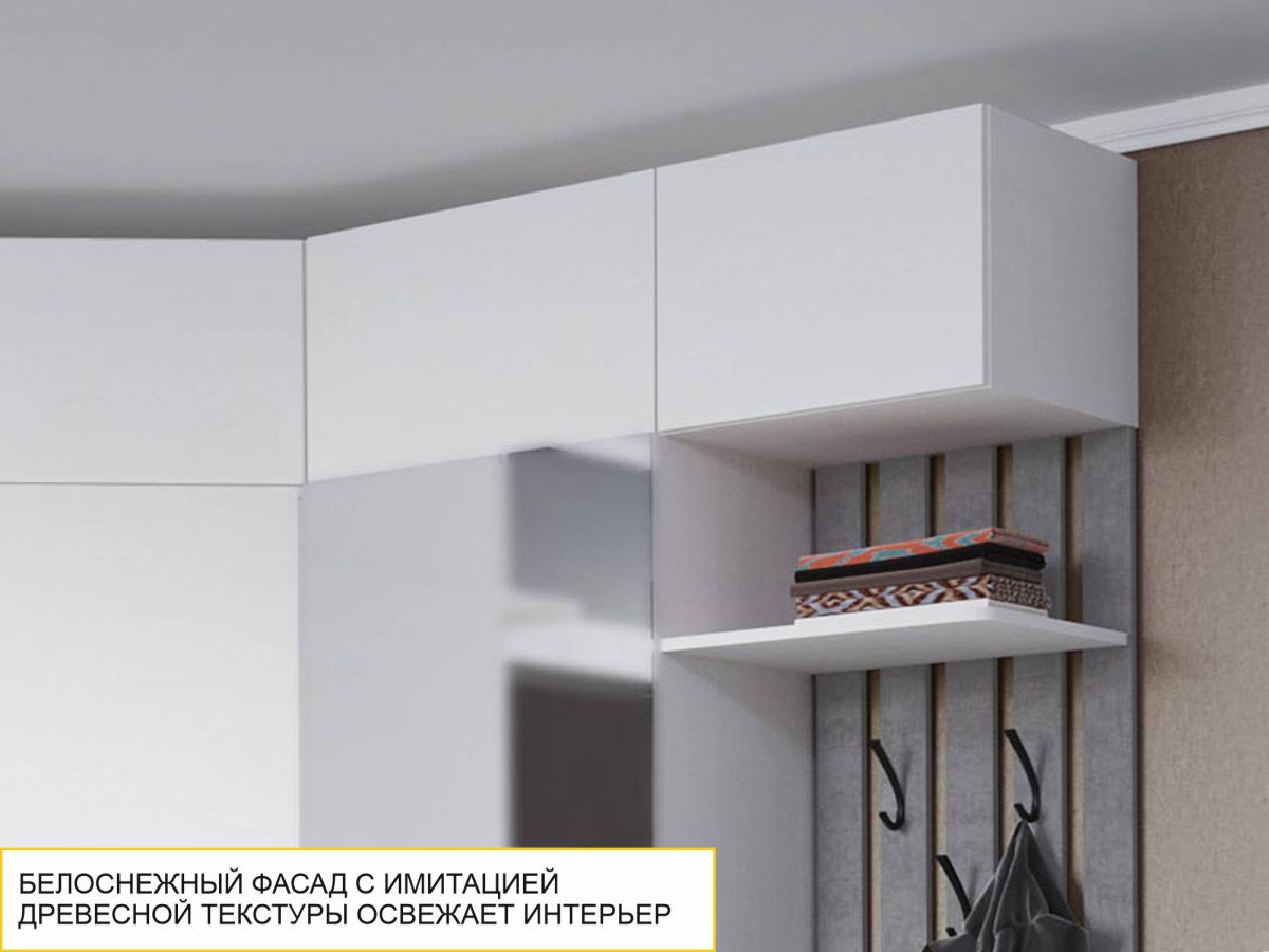 - Белоснежный фасад с имитацией древесной текстуры делает интерьер Вашей прихожей стильным и свежим.