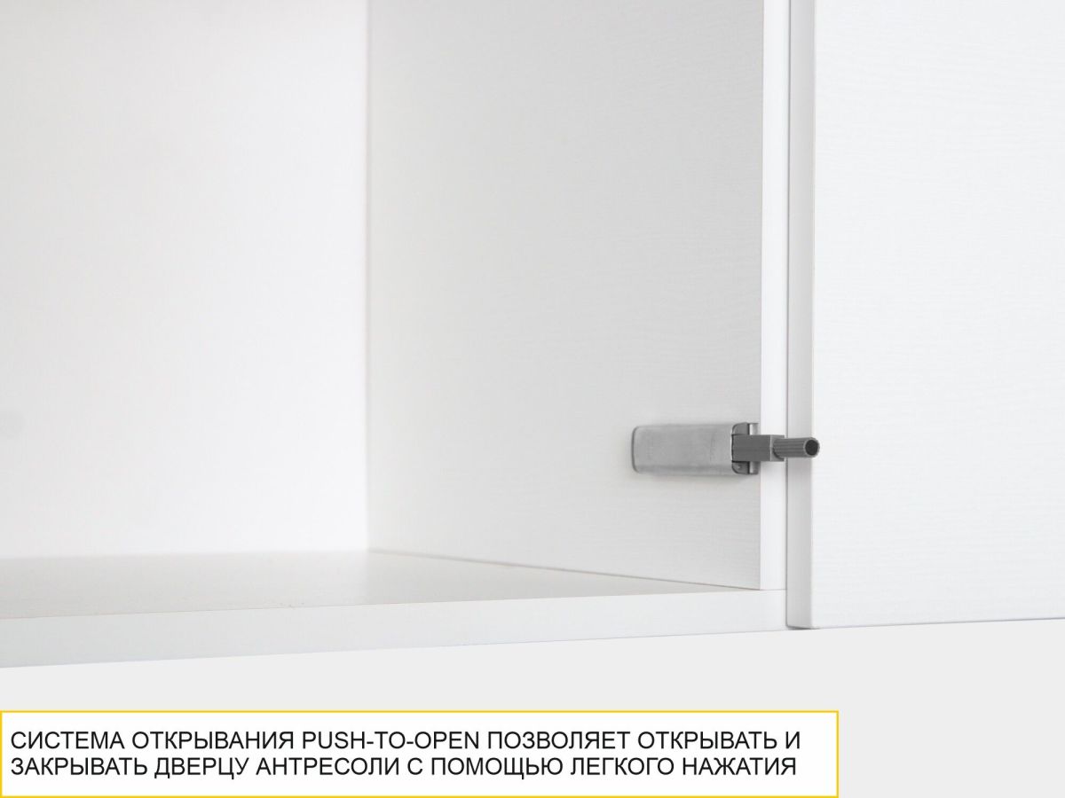 - Система открывания Push-to-Open позволяет открывать и закрывать дверцы антресоли с помощью легкого нажатия без использования мебельных ручек.