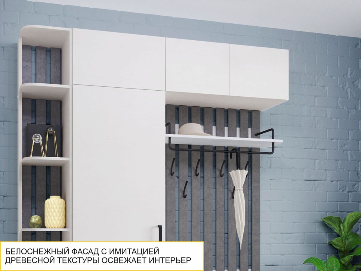 - Белоснежный фасад с имитацией древесной текстуры делает интерьер Вашей прихожей стильным и свежим.