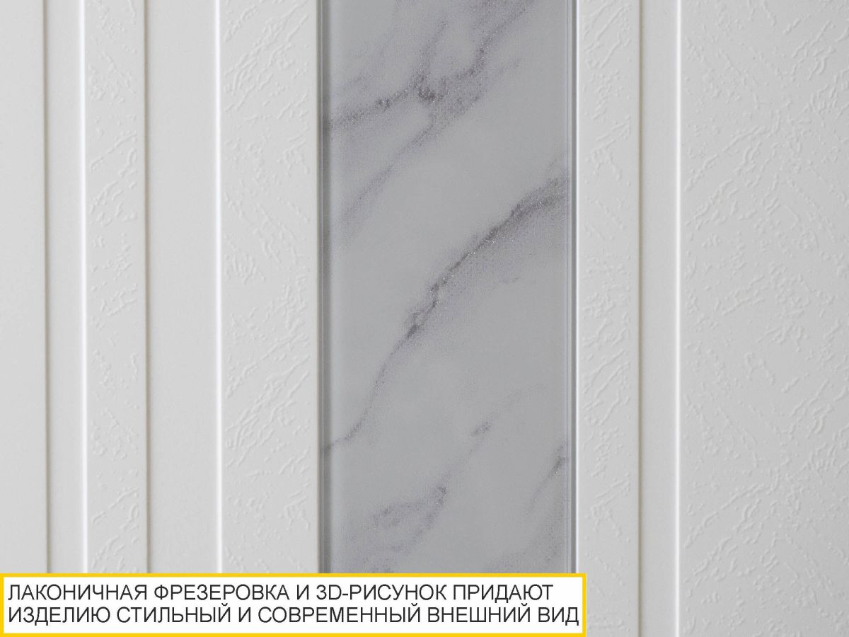 - Дверцы шкафа декорированы лаконичной фрезеровкой с объемным 3D-рисунком и стеклянной вставкой из прочного осветленного стекла Crystal с рисунком «мрамор».