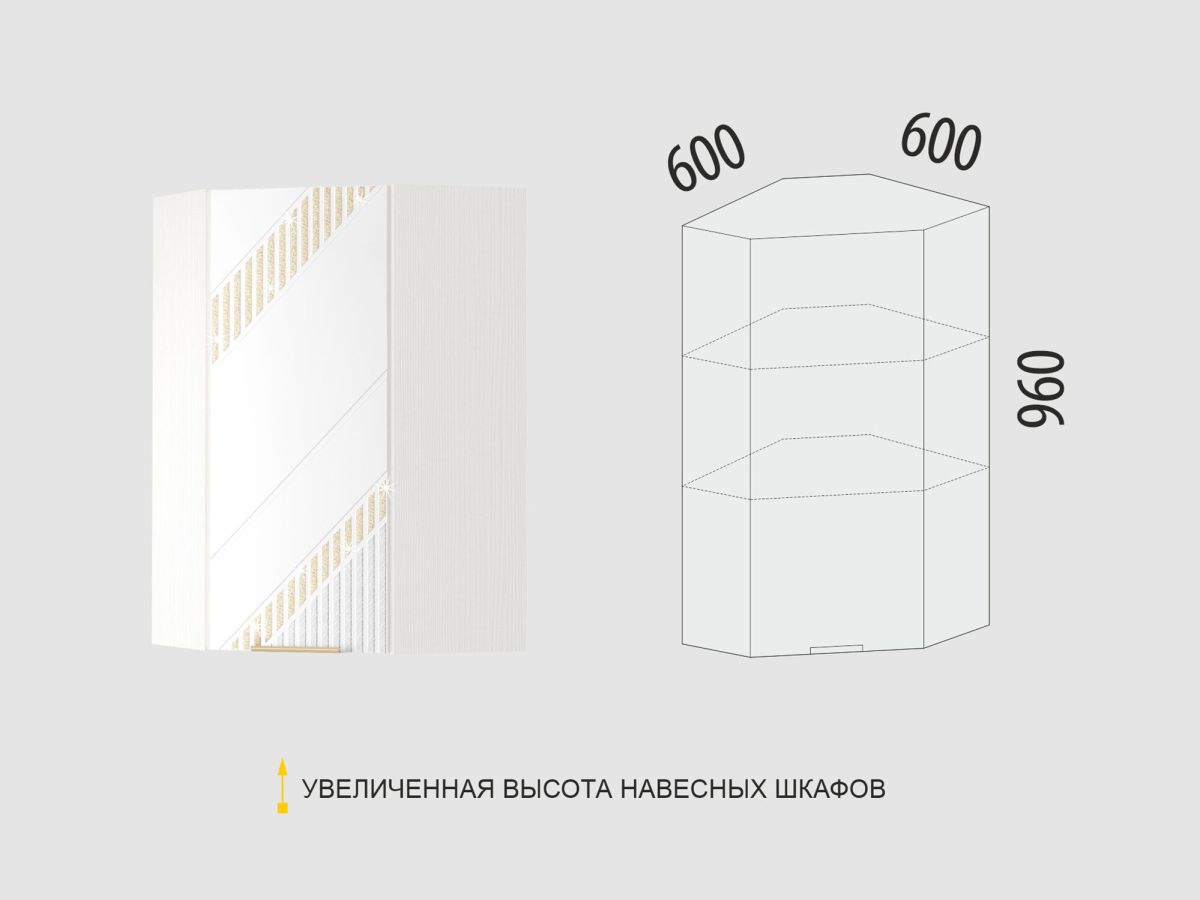 - Увеличенная высота навесных шкафов 96 см создает впечатление большего объема и высоты кухни, делая помещение более просторным и светлым.