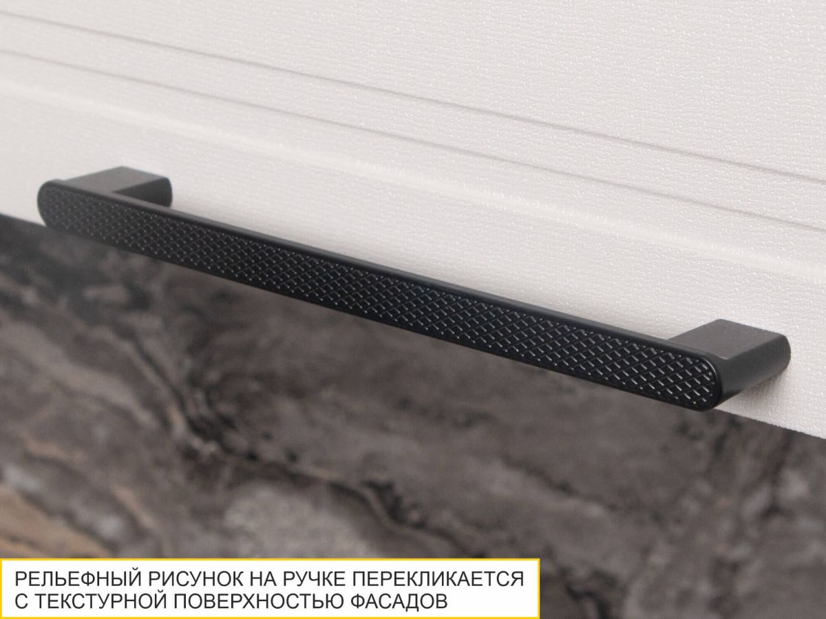 - Металлическая ручка черного цвета дополняет гармоничный образ кухни. Рельефный рисунок перекликается с текстурой на фасаде, создавая тактильное и визуальное единство.