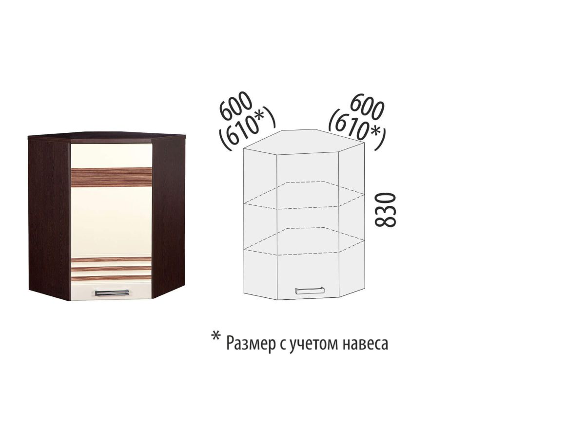 Угловой кухонный шкаф «Рио 16.20» входит в коллекцию мебели для кухни «Рио». Модель украшена фрезеровкой и стеклянной вставкой с рисунком. Оригинальная ручка подчеркивает современный дизайн. Плавное закрывание дверцы обеспечивают петли с доводчиками. Дверь открывается вправо. Ширина без учета навеса – 600х600 мм. Ширина с учетом навеса – 610х610 мм.