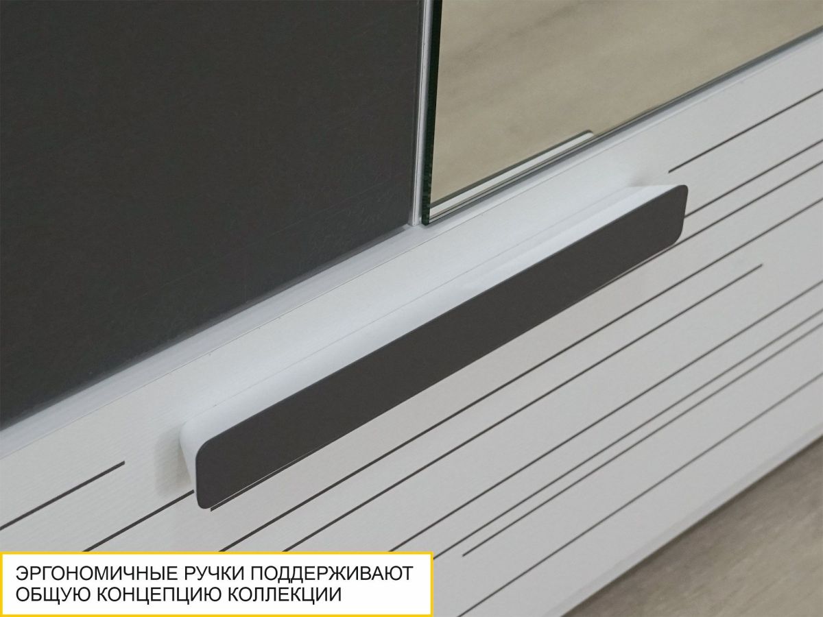 - Фасад в цвете «Графит» декорирован объемным тиснением. Рельефная текстура придает дизайну мебели выразительности, создает глубину и приятные тактильные ощущения.