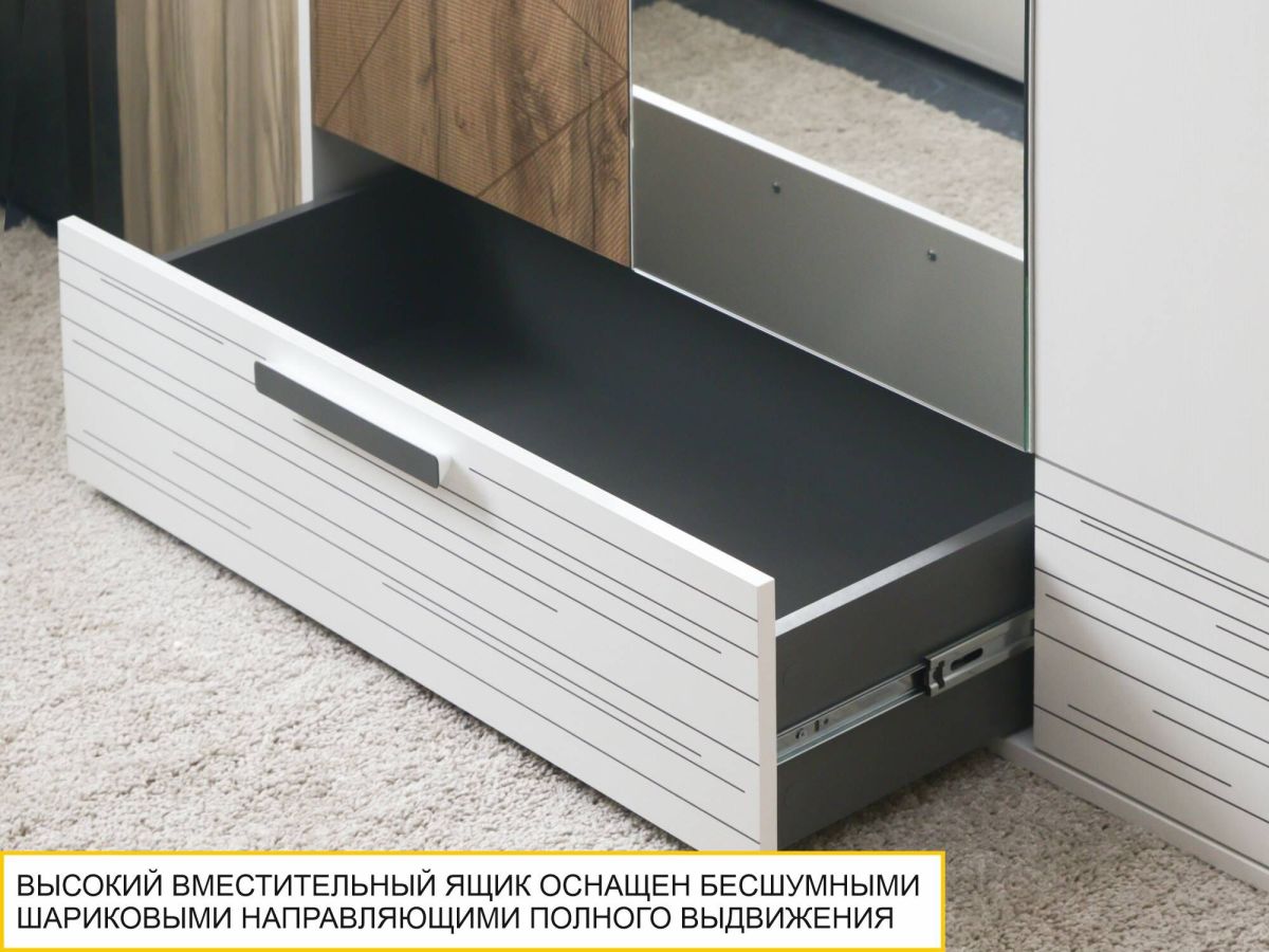 - Вместительный ящик в нижней части шкафа оснащен бесшумными шариковыми направляющими полного выдвижения, которые обеспечивают удобство и длительный срок эксплуатации.