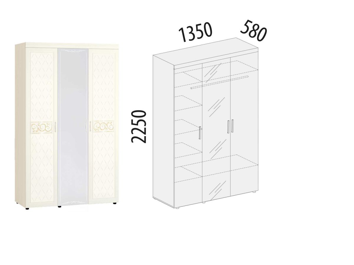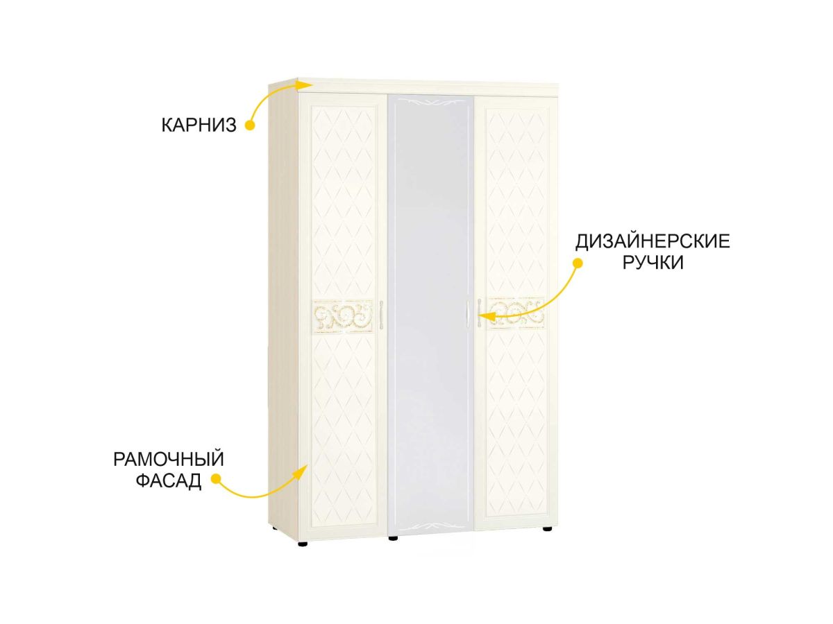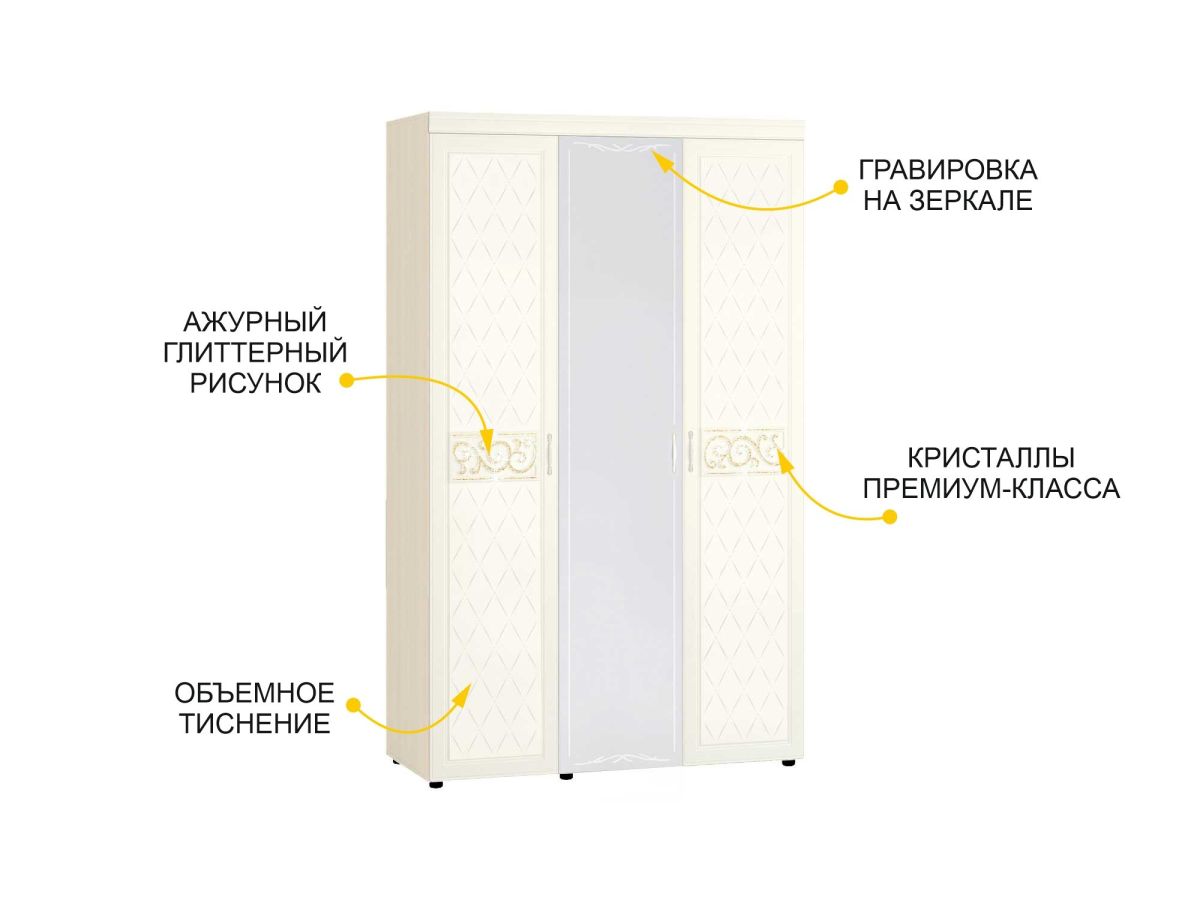 Трехдверный шкаф с зеркалом «Тиффани 93.12» является частью модульной программы «Тиффани». Коллекция «Тиффани» - символ классического стиля и незабываемого шарма. Нежные светлые фасады и изысканность декора - отличительная черта коллекции. Ажурные декоративные элементы и кристаллы придают уникальность коллекции.