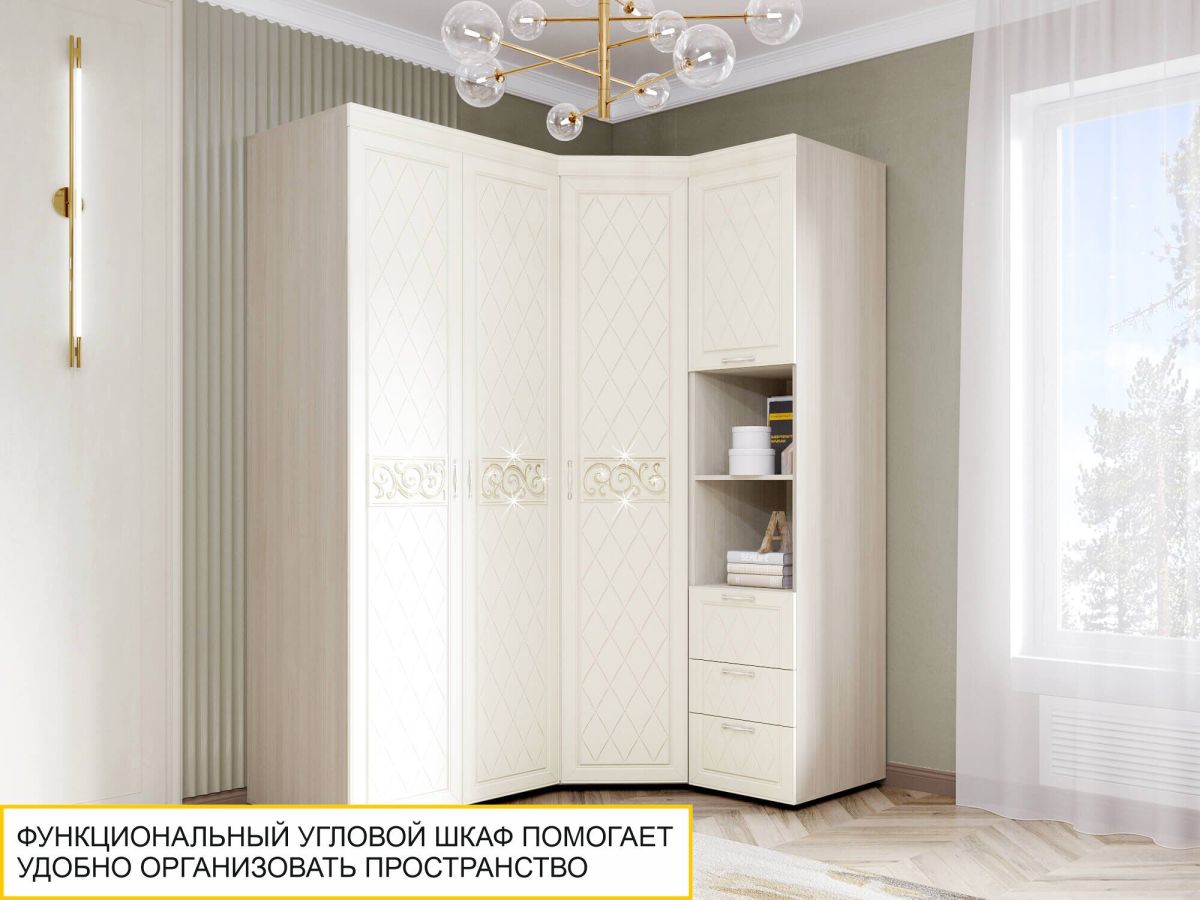Шкаф угловой «Тиффани 93.08» является частью модульной программы «Тиффани». Коллекция «Тиффани» - символ классического стиля и незабываемого шарма. Нежные светлые фасады и изысканность декора - отличительная черта коллекции. Ажурные декоративные элементы и кристаллы придают уникальность коллекции.